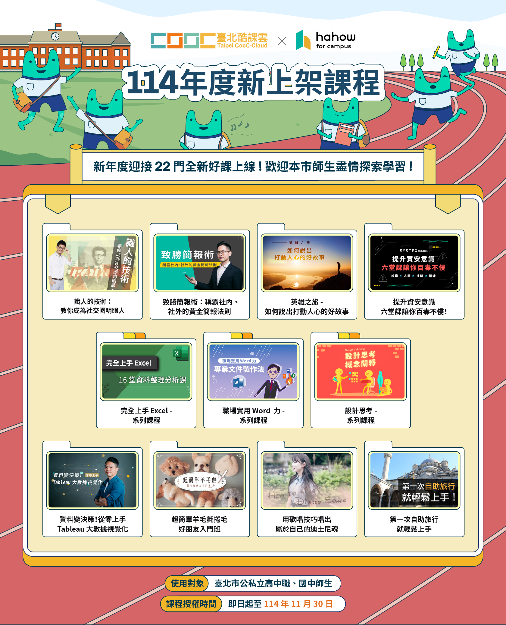 (二)課程授權期限:即日起(114年度新上架課程授權自114 年1月1日起)至114年11月30日止。