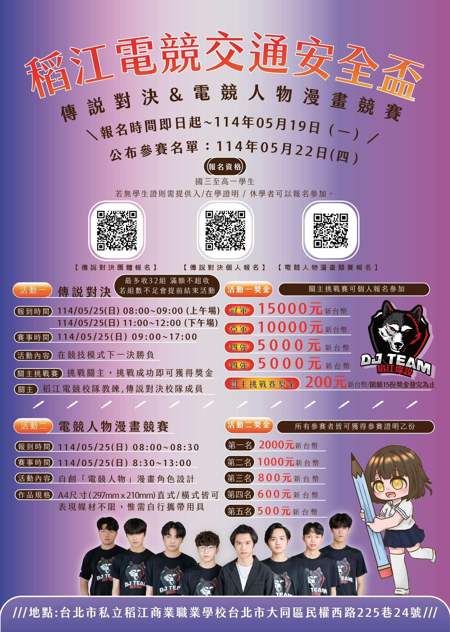 一、稻江電競交通安全盃─傳說對決 & 電競人物漫畫競賽由臺 北市私立稻江高級商業職業學校主辦,結合熱門電競遊戲 《傳說對決》與創意繪畫的「電競人物漫畫競賽」,透過 競賽活動提升學生團隊合作與創意表達能力,同時融入交 通安全知識,打造寓教於樂的校園電競盛事!