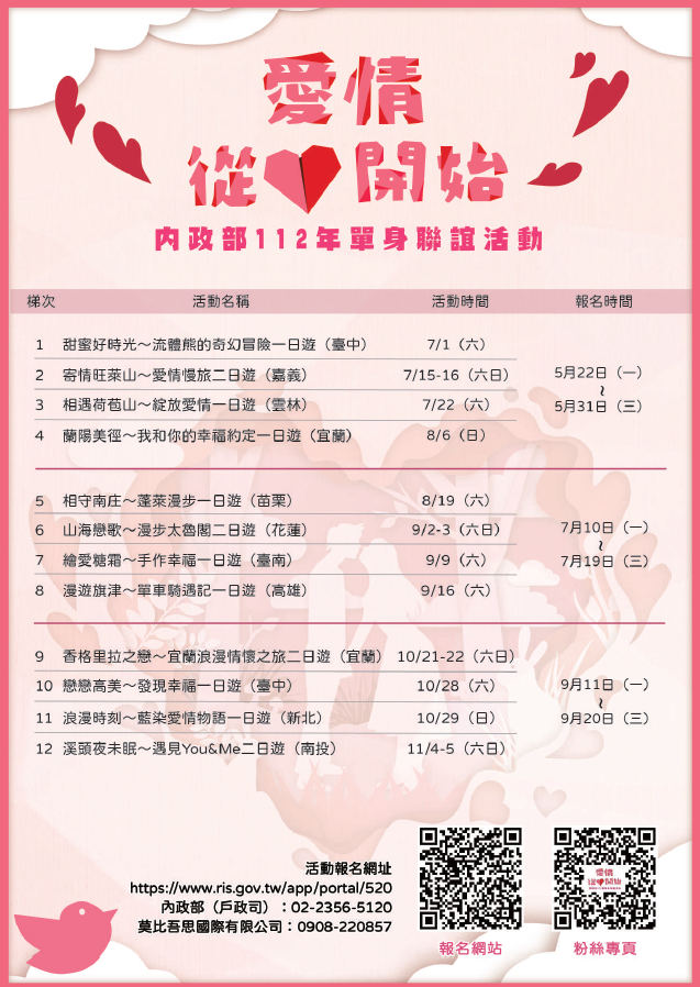 旨揭活動訂於112年9月11日中午12 時起至9月20日止受理報名,活動詳情及報名方式請參閱活動網頁 (https://www.ris.gov.tw/app/portal/520)。
