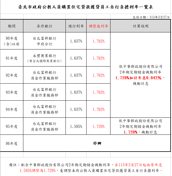 一、中華郵政股份有限公司2年期定期儲金機動利率自113年3月27日起由原1.595%調整為1.720%,爰配合調整旨揭獲貸員工自行負擔利率如下: