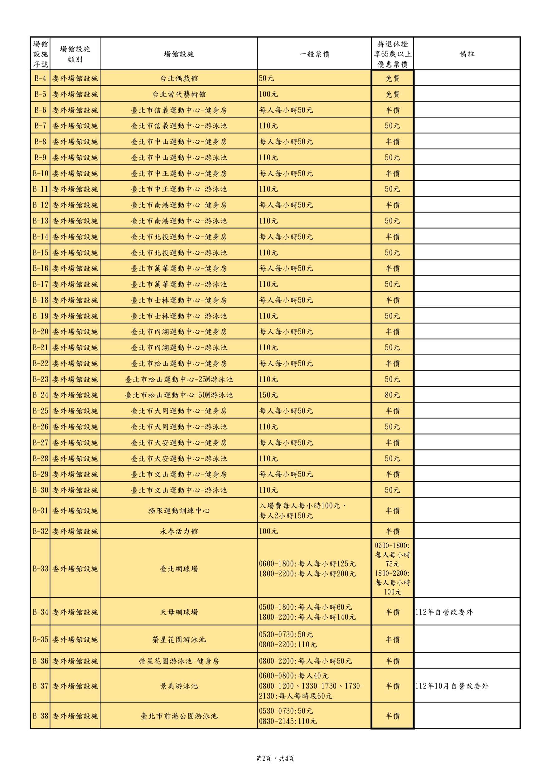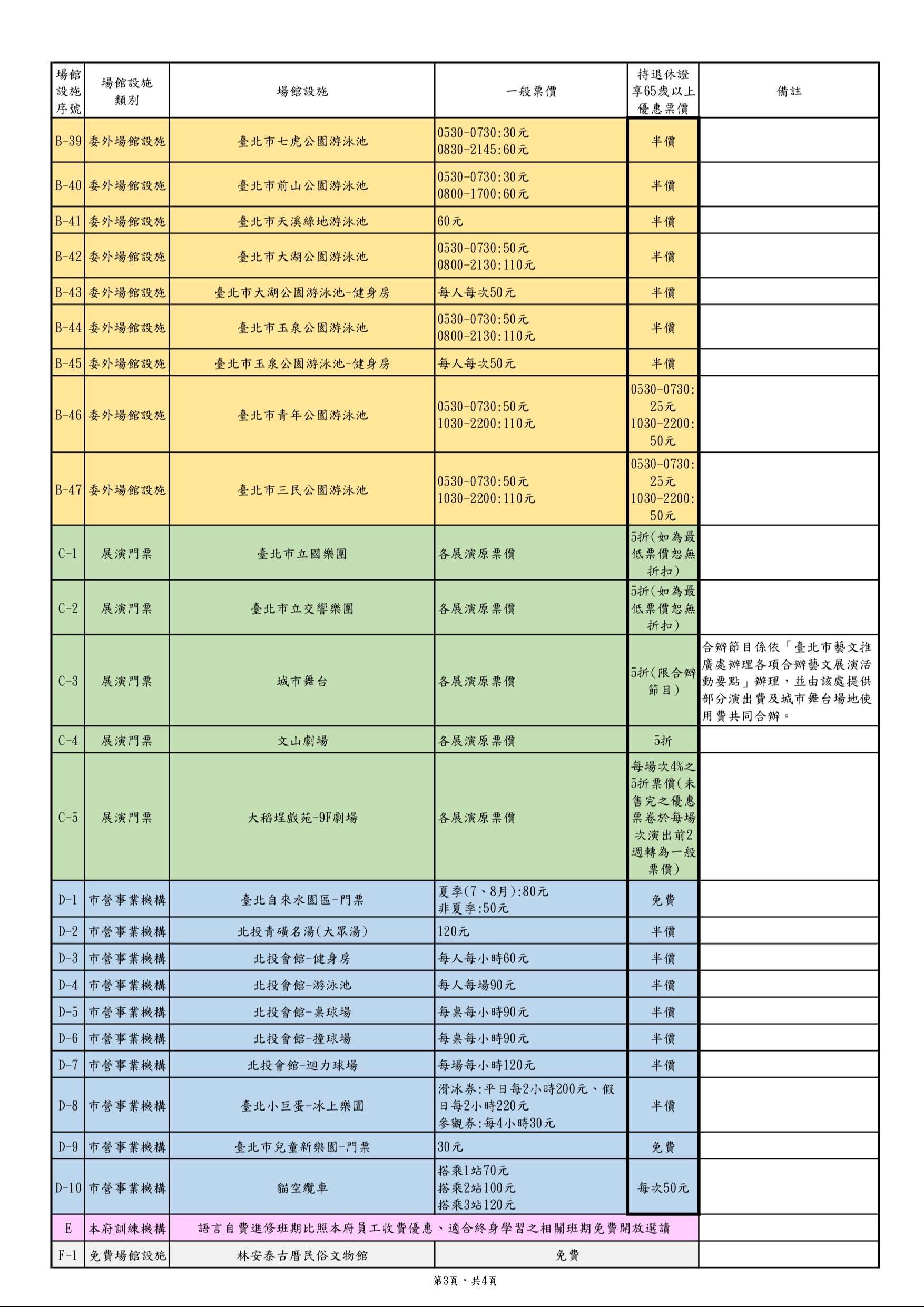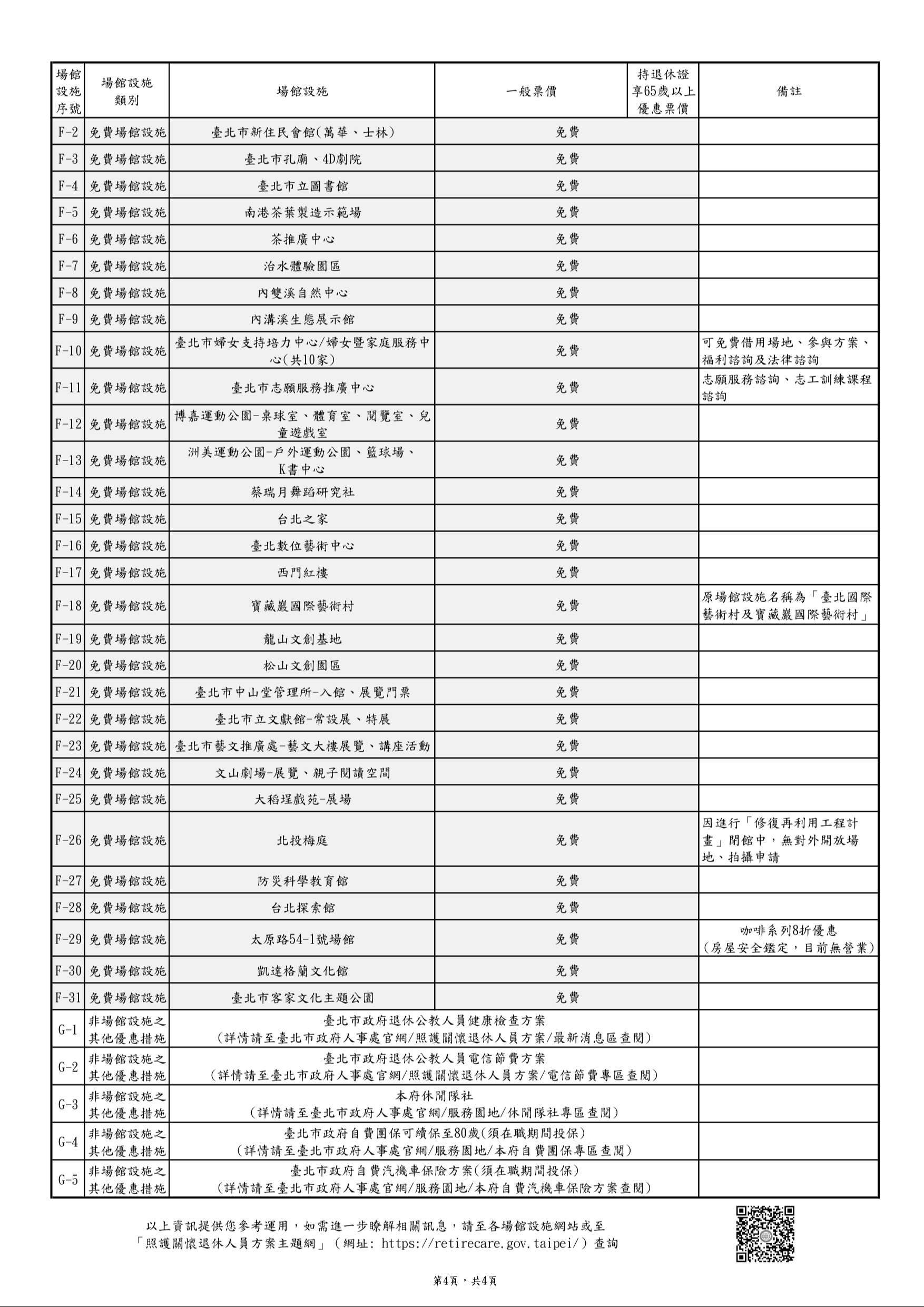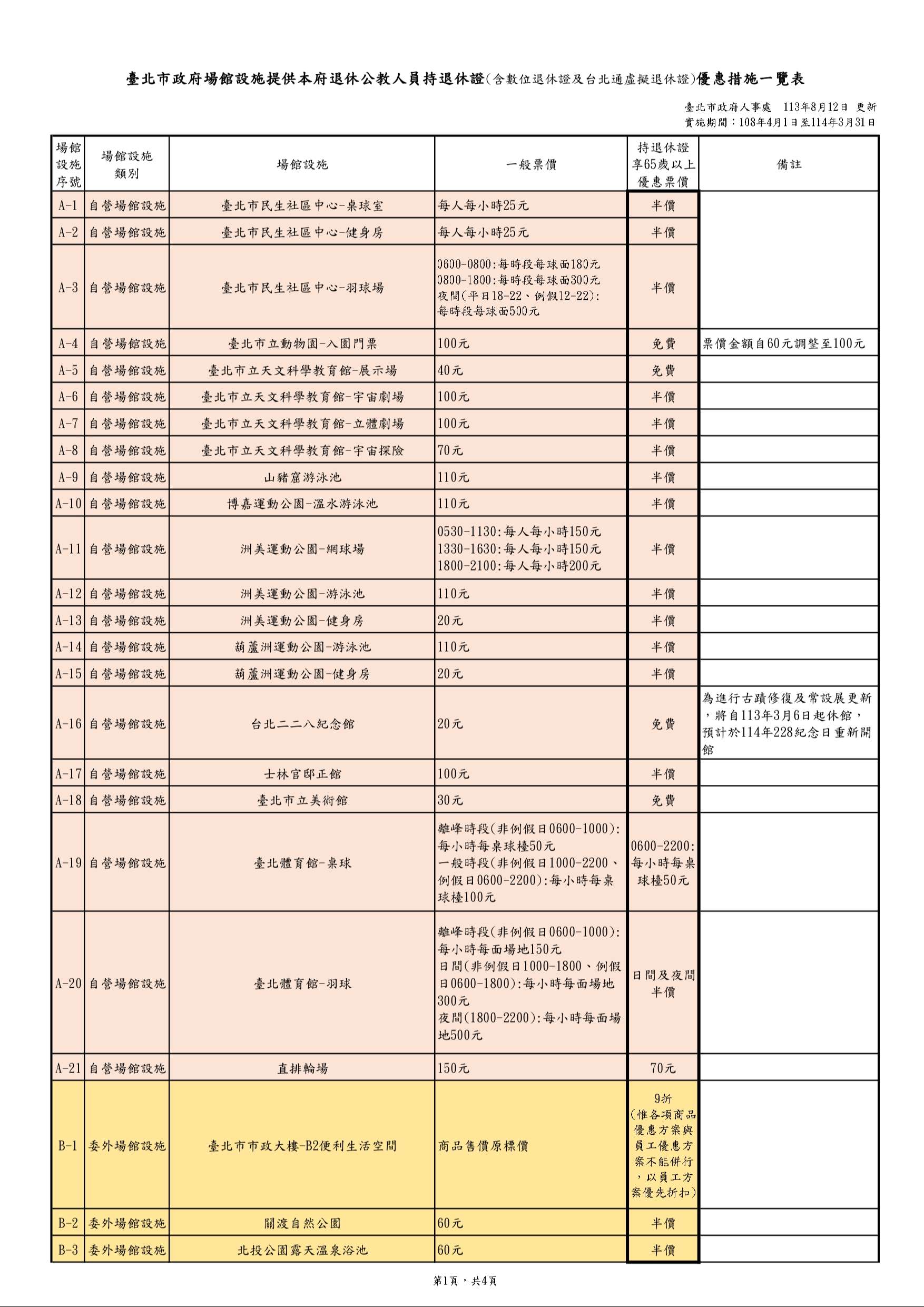 主旨:檢送修正「臺北市政府場館設施提供本府退休公教人員持退休證(含數位退休證及台北通虛擬退休證)優惠措施一覽表」,請查照。