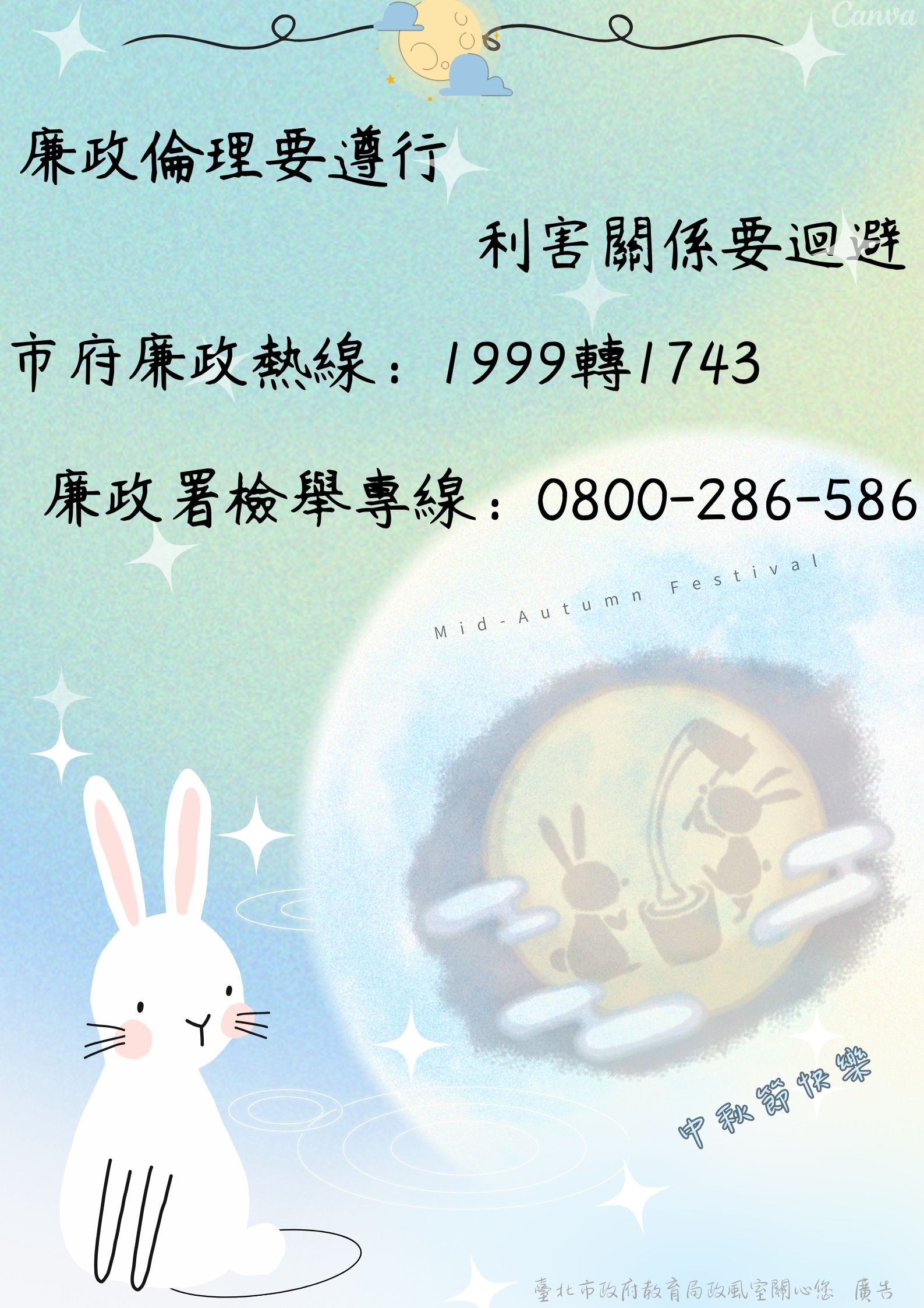 中秋節將屆,餽贈、邀宴行為較為頻繁,請同仁恪遵「臺北市政府公務員廉政倫理規範」規定,對與職務有利害關係者之受贈財物、飲宴應酬、請託關說及其他廉政倫理事件,應依規定確實報備登錄,並避免酒駕、出入不正當場所之違法違紀行為。