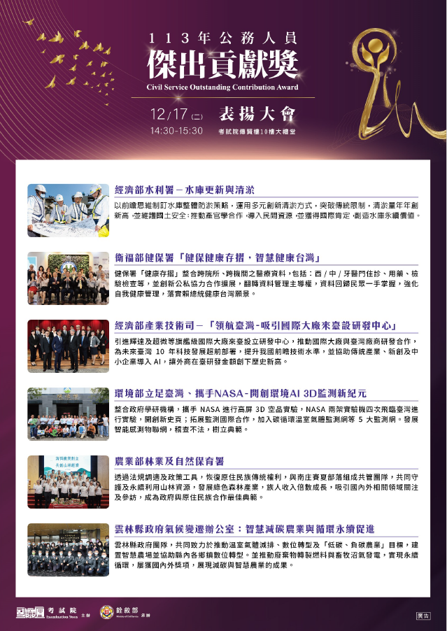113年公務人員傑出貢獻獎業經考試院組成評審委員會評選出6名得獎人及6組得獎團體;