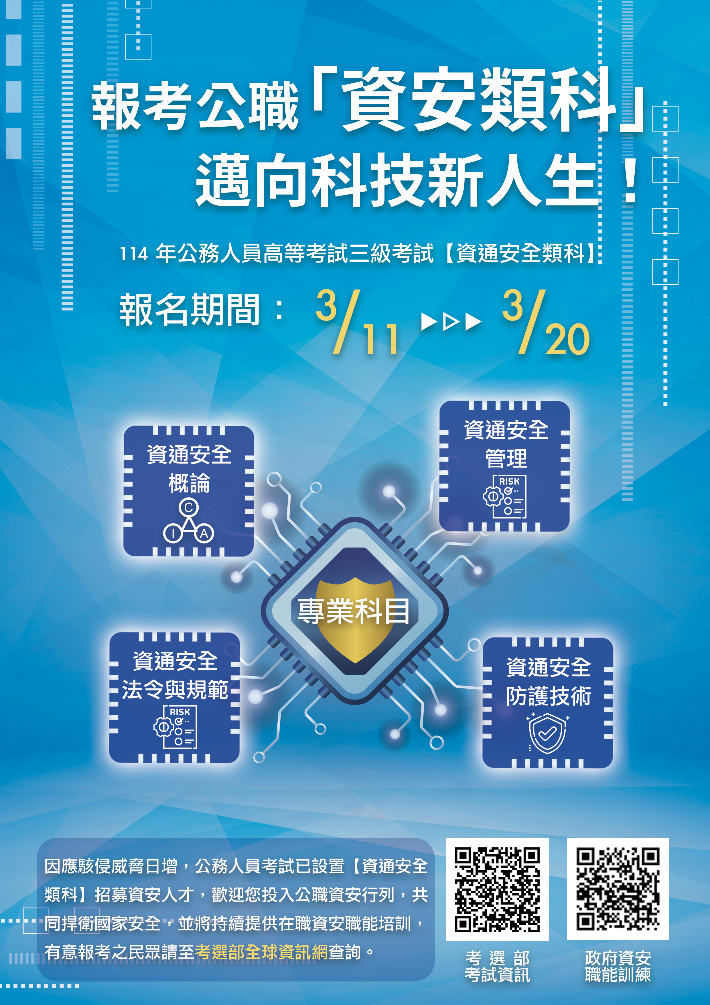 本(114)年度旨揭考試報名日期,將自114年3月11日起至同年3月20日止受理報名,有意願報考之民眾請至考選部全球資訊網查詢。