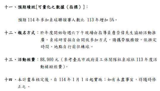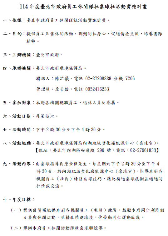 主旨:檢送「臺北市政府114年員工休閒隊社桌球社活動實施計畫」1份,請鼓勵貴屬同仁、退休人員及其眷屬踴躍參加,請查照。