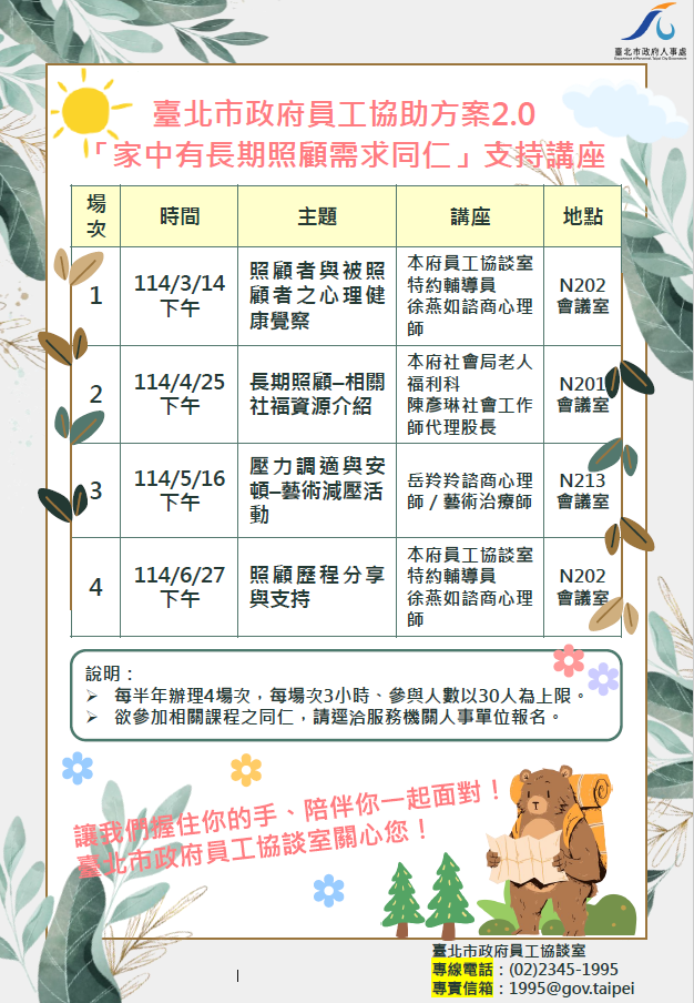 本府於114年上半年對於各機關學校「家中有長期照護需求同仁」,特辦理旨揭講座4場次,每場次3小時、參與人數 以30人為上限,講座主題著重情緒減壓、同儕支持及資源介紹,各場次主題及相關事項如下: