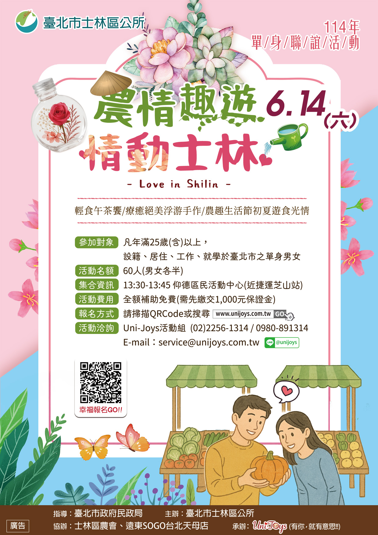 臺北市士林區公所114年『農情趣遊情動士林』單身聯誼活動,將於114年6月14日(星期六)13時30分至18時,假仰德區民活動中心、遠東SOGO百貨士林3號廣場舉辦,線上報名時間114年4月28日(星期一)起至114年5月30日(星期五)或額滿為止,名額為男、女性各30人,總計60個名額,歡迎年滿25歲(含)以上設籍、居住、工作或就學於臺北市(士林區及未曾參加本區單身聯誼者優先錄取)之未婚單身男女踴躍報名參加,詳情請見報名簡章及士林區公所官網最新消息或電洽(02)2882-6200分機6502宋小姐。