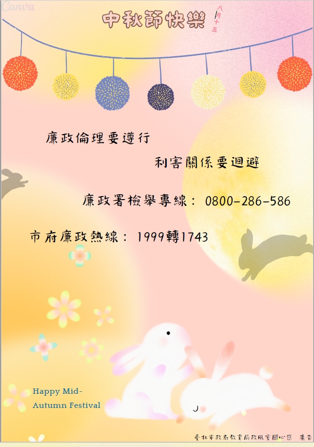 中秋節將屆,餽贈、邀宴行為較為頻繁,請同仁恪遵「臺北市政府公務員廉政倫理規範」規定,對與職務有利害關係者之受贈財物、飲宴應酬、請託關說及其他廉政倫理事件,應依規定確實報備登錄,並避免酒駕、出入不正當場所之違法違紀行為。