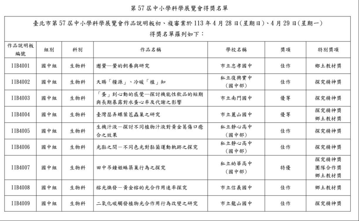 恭喜!! 701-林宥均同學獲得「臺北市第57屆中小學科學展覽會」生物科優等獎。感謝701王鈺婷老師及王進龍老師指導。其得獎作品「臺灣瑟弄蝶葉苞蟲巢之研究」,將放置於課研組前走廊展示。
