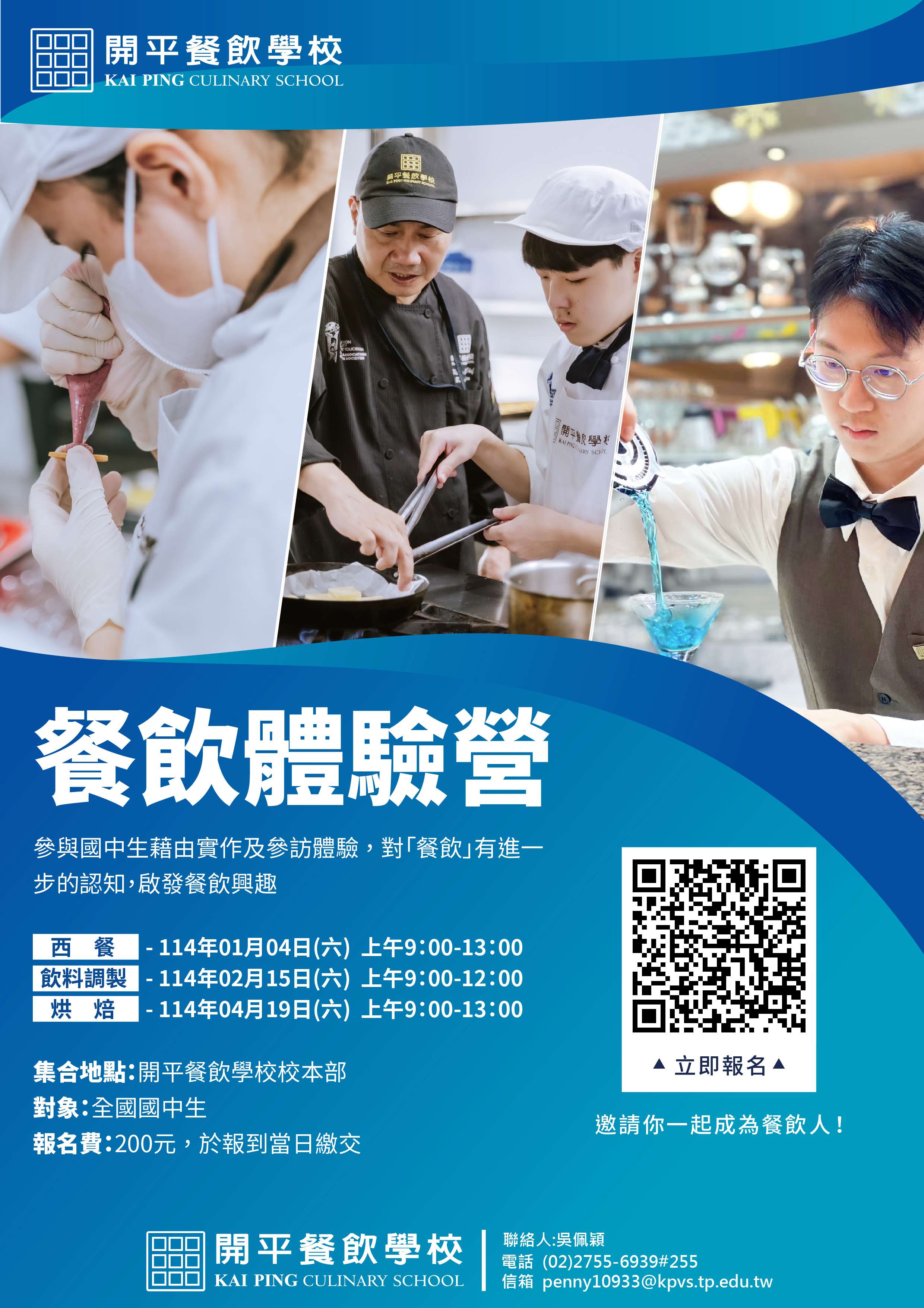 一、為協助國中生認識技職體系之學習內容、教學特色及進路 發展,本次活動為透過餐飲實作體驗更加了解技職教育, 以料理展現自