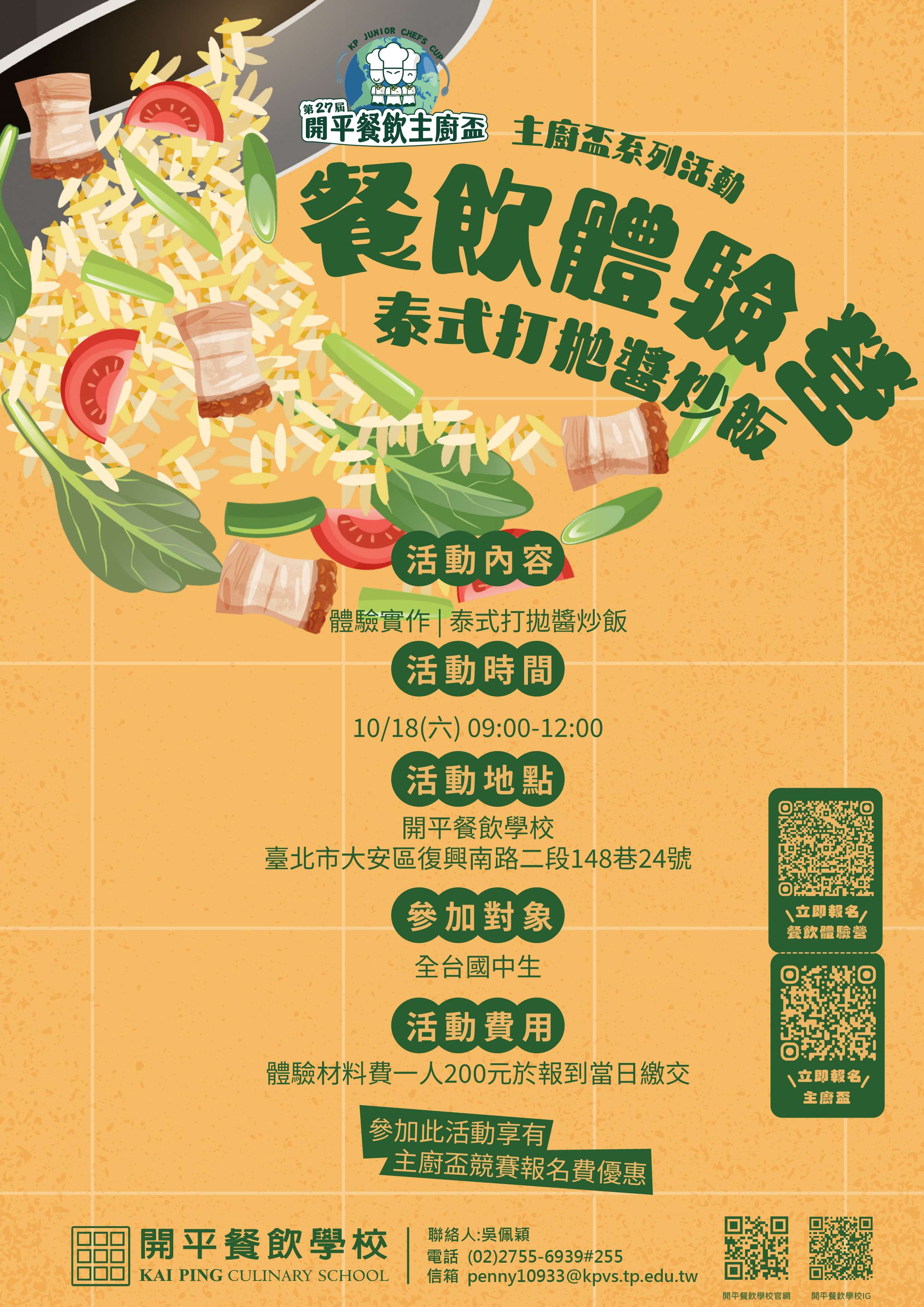 一、 活動目的:本次活動結合第27屆主廚盃國中競賽活動,透過「泰式打拋醬炒飯」實作體驗更加了解技職教育,以料理展現自我、創造未來無限可能。