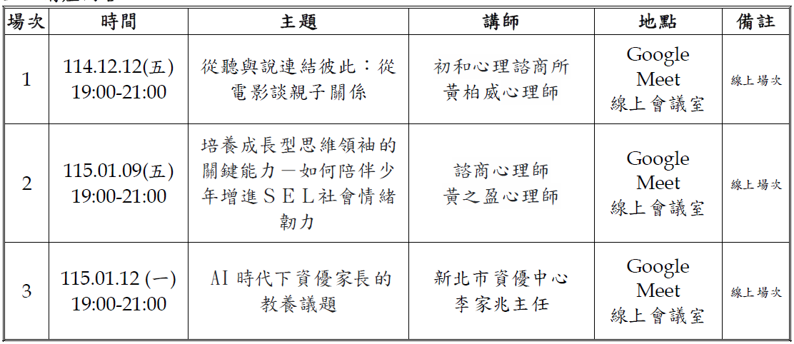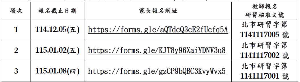 (三)錄取公告:各場次錄取名單將於各場次研習前3天,公告於資優教育資源中心網站(https://trcgt.tp.edu.tw/),另以電子郵件方式寄送線上會議室連結網址通知至個人信箱(家長:報名登錄信箱;教師:臺北市教師在職研習網登錄信箱)。