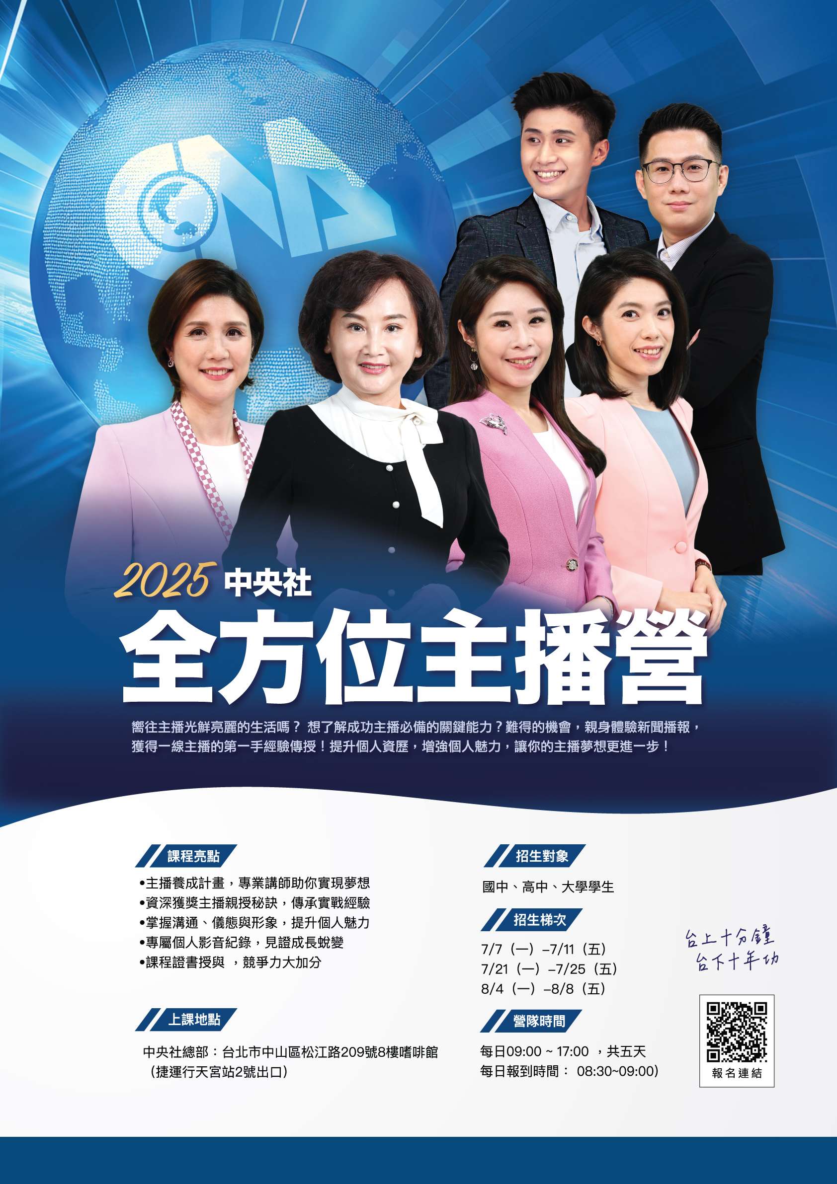 二、本社將於2025年7、8月首次對外辦理全方位主播營及新聞 營,透過專業課程,讓參加者親身體驗新聞播報、了解新 聞工作,進一步掌握溝通技巧、提升個人魅力。課程並有 專屬影音紀錄及證書授與,為個人資歷加分。 三、敬請貴校協助於網站及公佈欄刊登報名資訊,自即日起接 受報名。