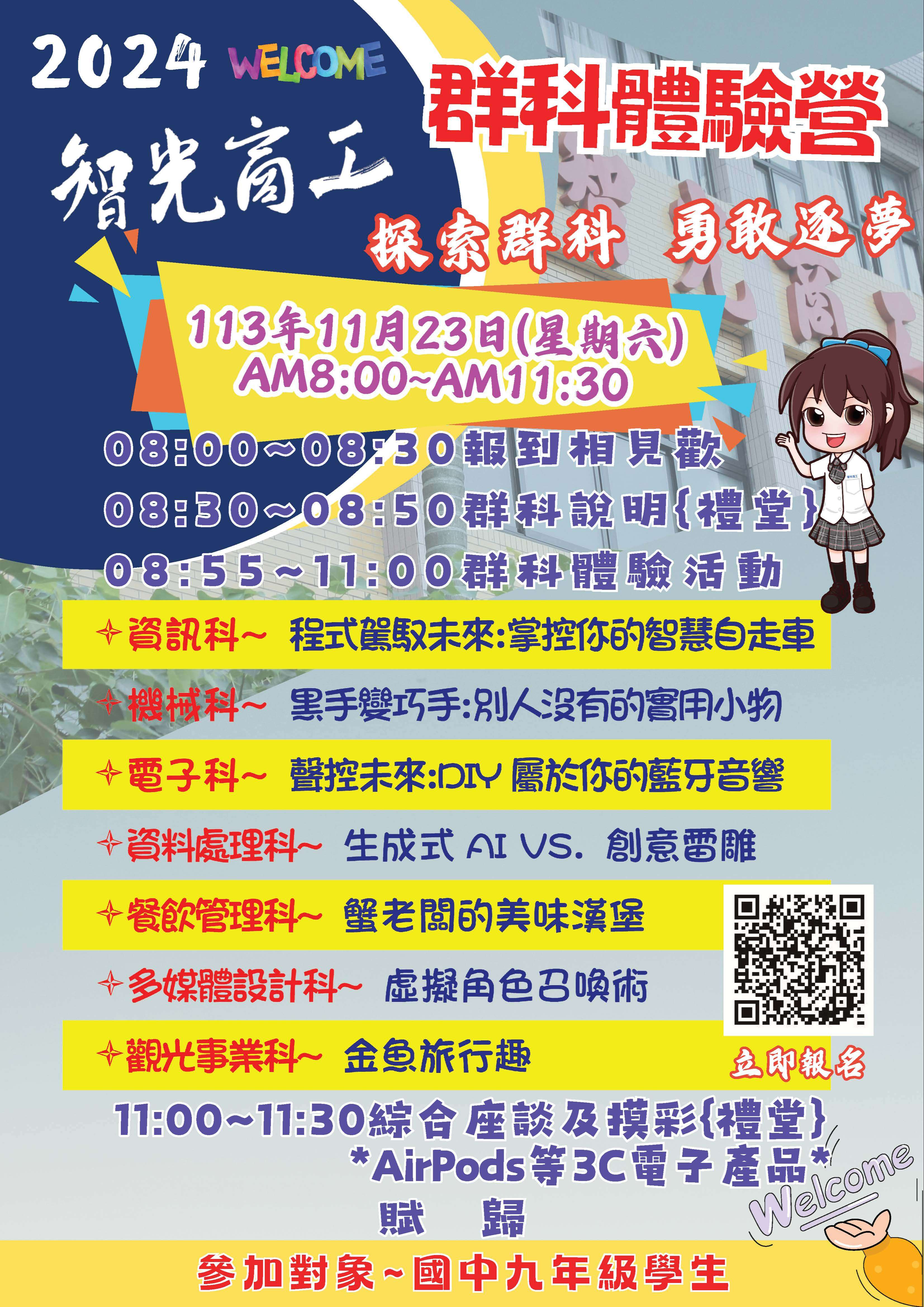 一、依據國教署113學年度高級中等學校完全免試入學資源挹注 計畫B2-1「生涯探索、預見未來」子計畫辦理。 二、活動時間:113年11月23日(星期六) 08:00~11:30 三、活動地點:新北市智光商工 四、活動費用:免費 五、詳細內容如附件 六、活動聯絡人:智光商工教務處招生組劉仲平組長,電話 (02)-2943-2491分機888。 七、敬請協助公告,並鼓勵九年級學生踴躍報名參加