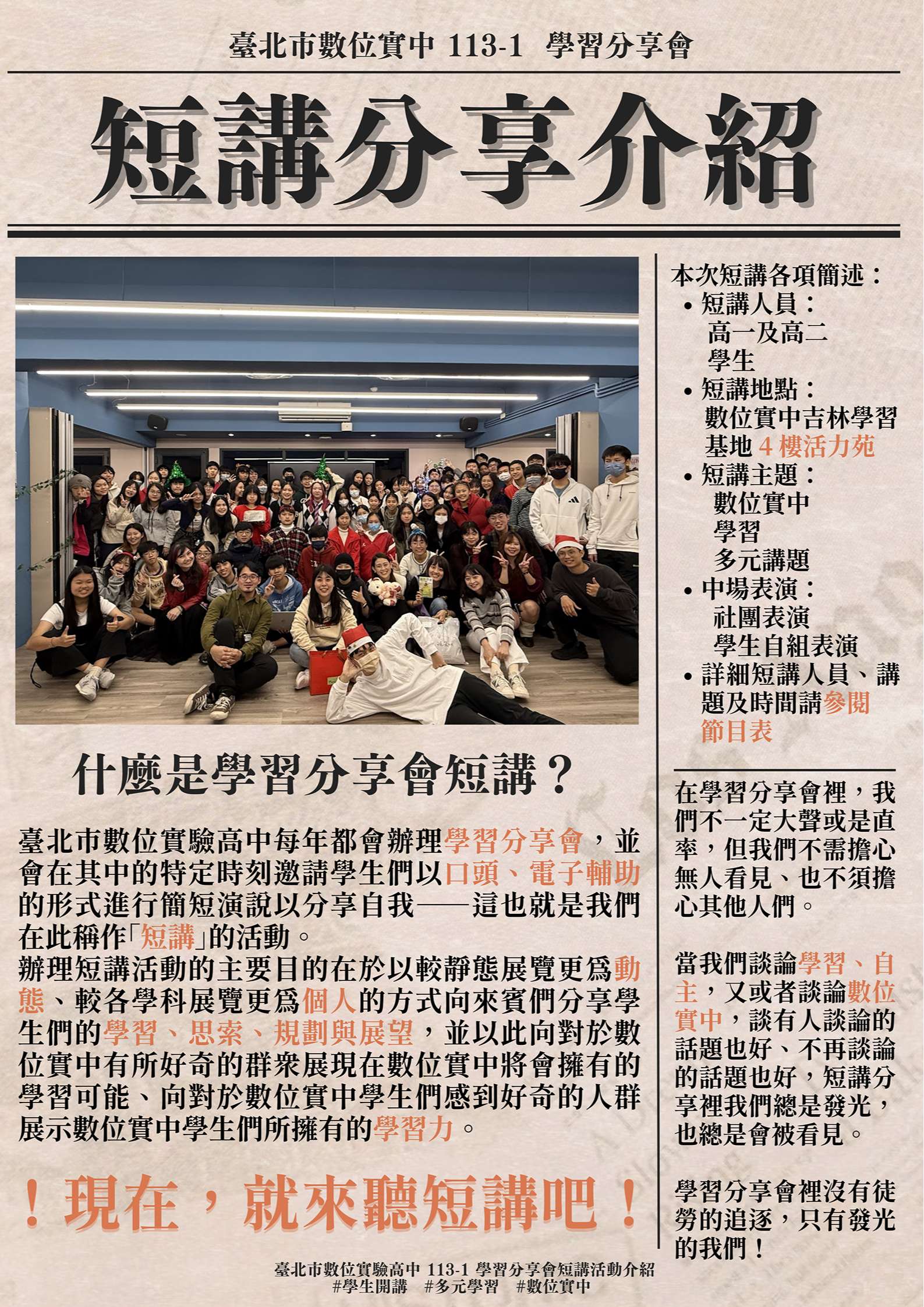 一、為促進校際間學習經驗交流與教學創新發展,並提供學生 展示學習成果與分享經驗的平台,本校特辦理學習分享會 活動,歡迎各界參與。