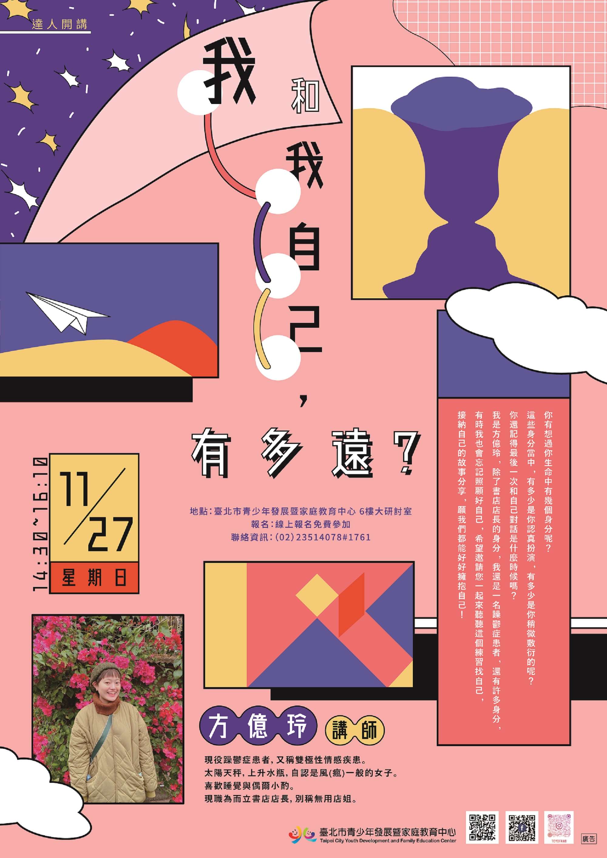 二、活動說明如下: (一)參加對象:青少年學子及一般民眾。 (二)活動時間:111年11月27日(星期日)下午2時30分至4時 10分。 (三)報名方式:網路報名(另開新視窗)。 (四)報名費用:免費。 (五)活動地點:臺北市青少年發展暨家庭教育中心6樓大研討室(臺北市中正區仁愛路1段17號)。