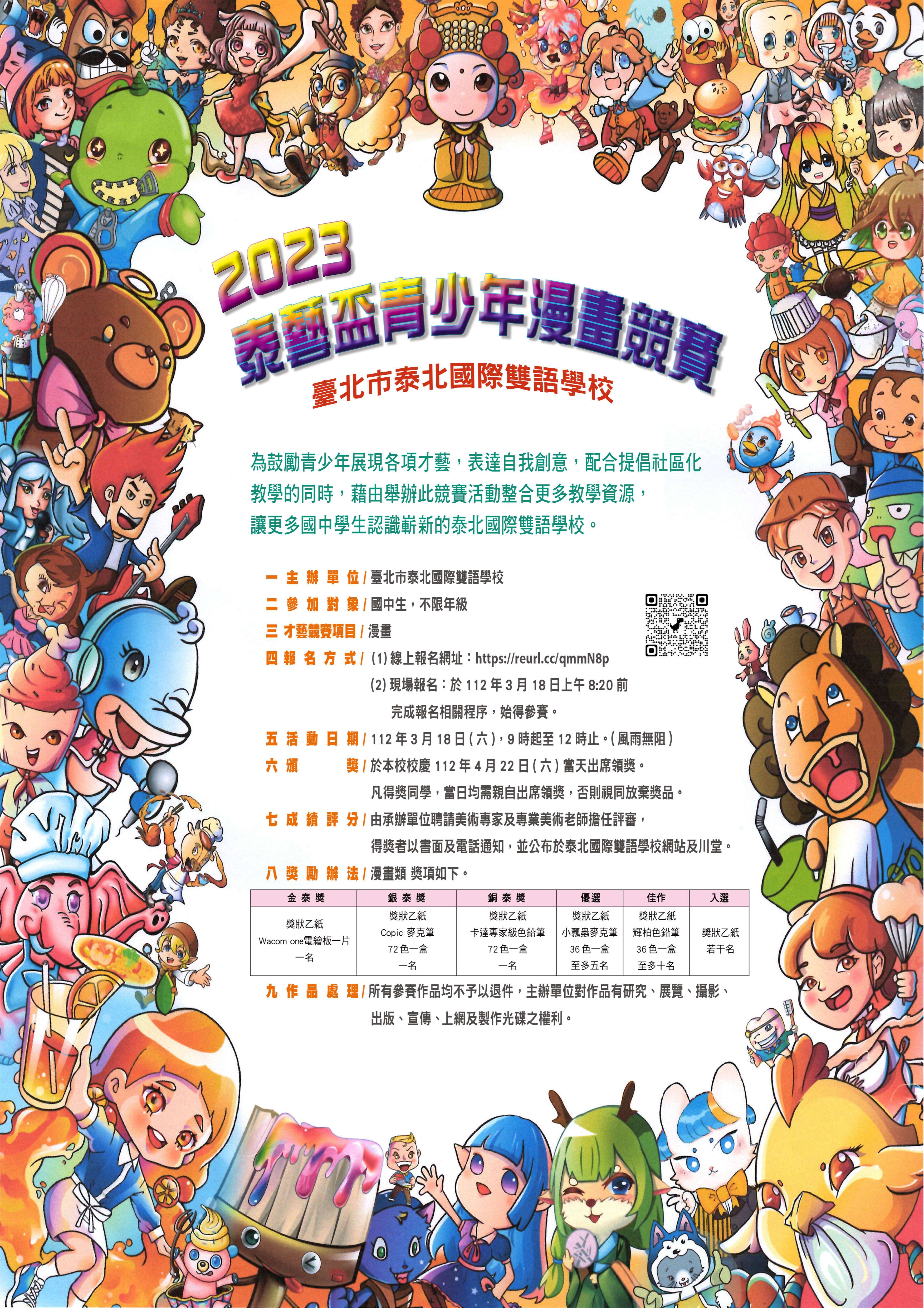 一、為推廣美術教育,鼓勵青少年美術創作風氣,本校秉持多 年來對美術教育不遺餘力的精神,積極配合提倡社區化教 學,特舉辦「泰藝盃」青少年漫畫比賽,藉此鼓勵對漫畫 創作有興趣的青少年朋友,提昇美術創意教育。