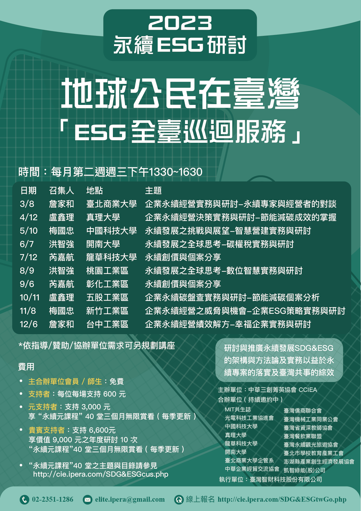 三、【地球公民在台灣】【ESG全臺巡迴服務】系列活動請參閱 下列網址:永續活動1 培育菁英服務地球【認證課程】 http://cie.ipera.com/SDG&ESGcus.php、永續活動2 持續精進為淨零【系列活動】http://cie.ipera.com /SDG&ESGact.php、永續活動3 與世界同步永續【永續ESG 研討】http://cie.ipera.com/SDG&ESGtwGo.php。