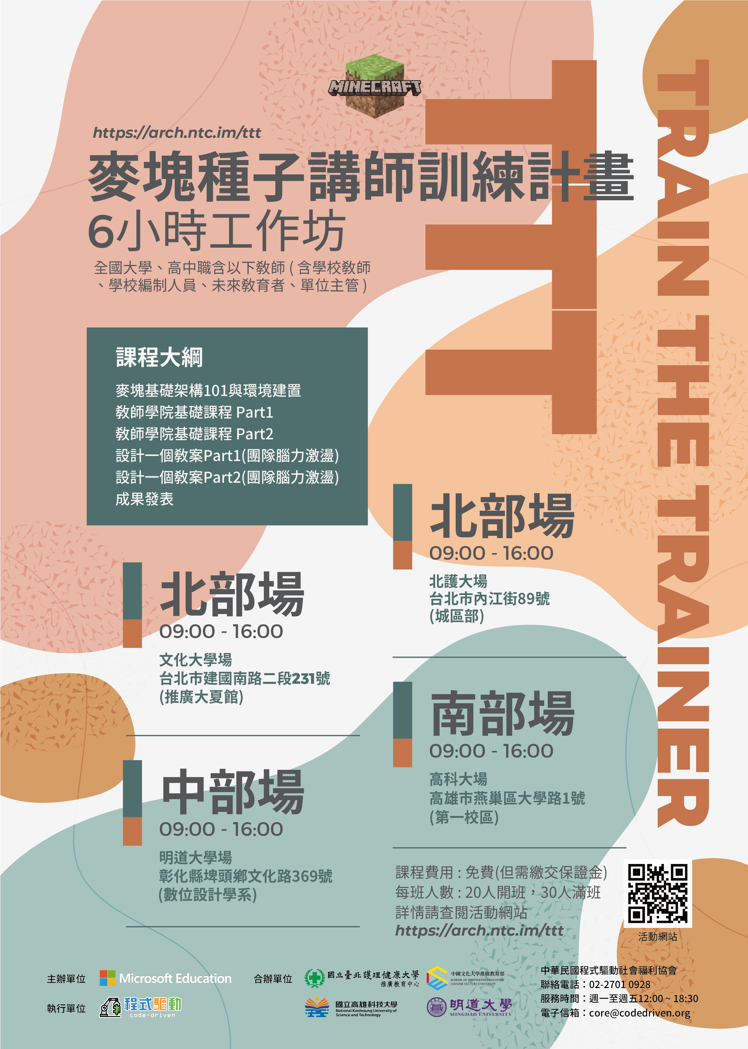 國立臺北護理健康大學推廣教育中心協助中華民國程式驅動社會福利協會辦理『麥塊種子講師訓練計畫』,請有興趣老師自行報名參加(請參閱附件資料)。