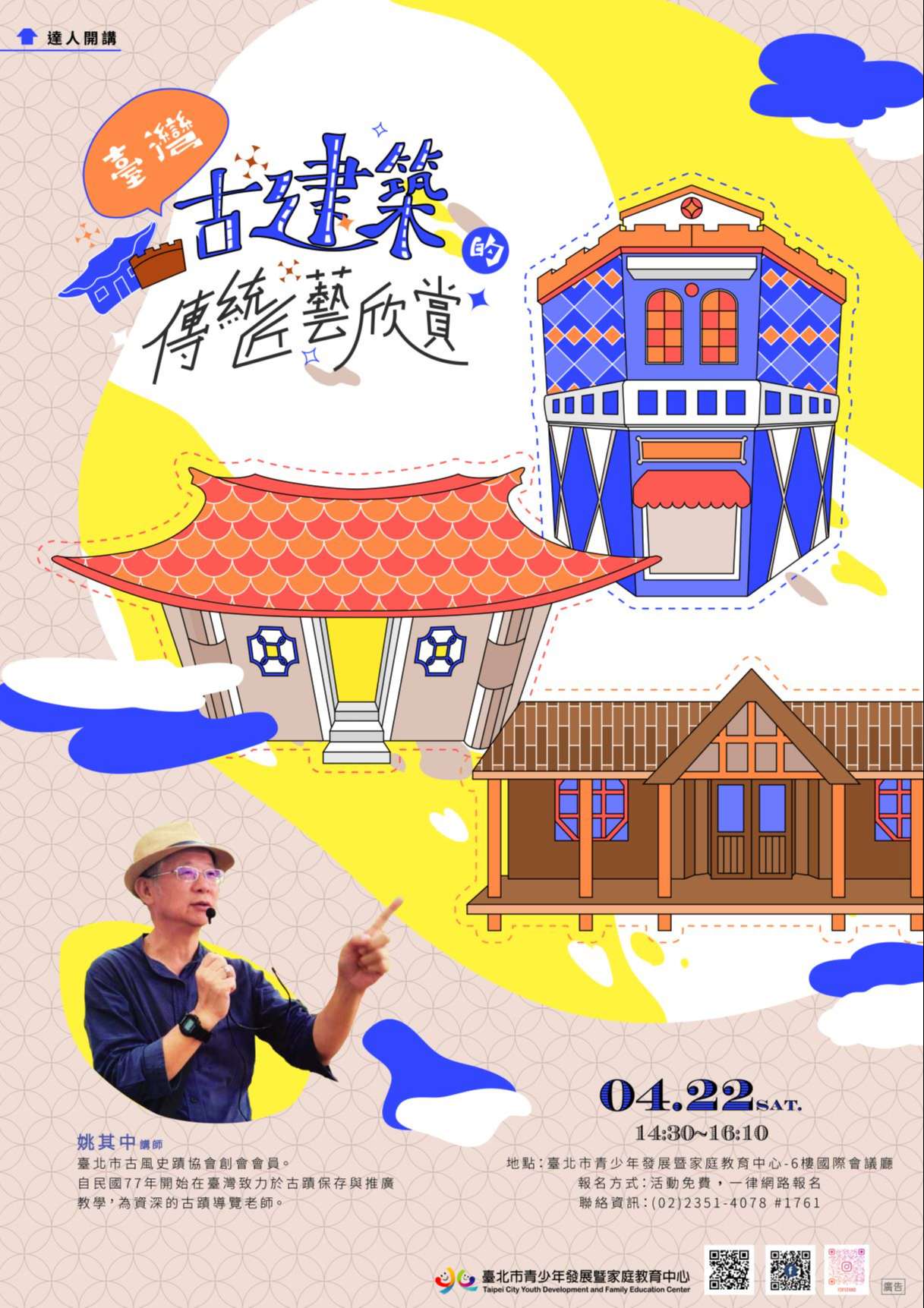 (一)90字:臺北市青少年發展暨家庭教育中心4月22日14:30 舉辦壯遊達人開講「臺灣古建築的傳統匠藝欣賞」,姚 其中老師領讀臺灣古蹟之美,提昇青年學子對臺灣