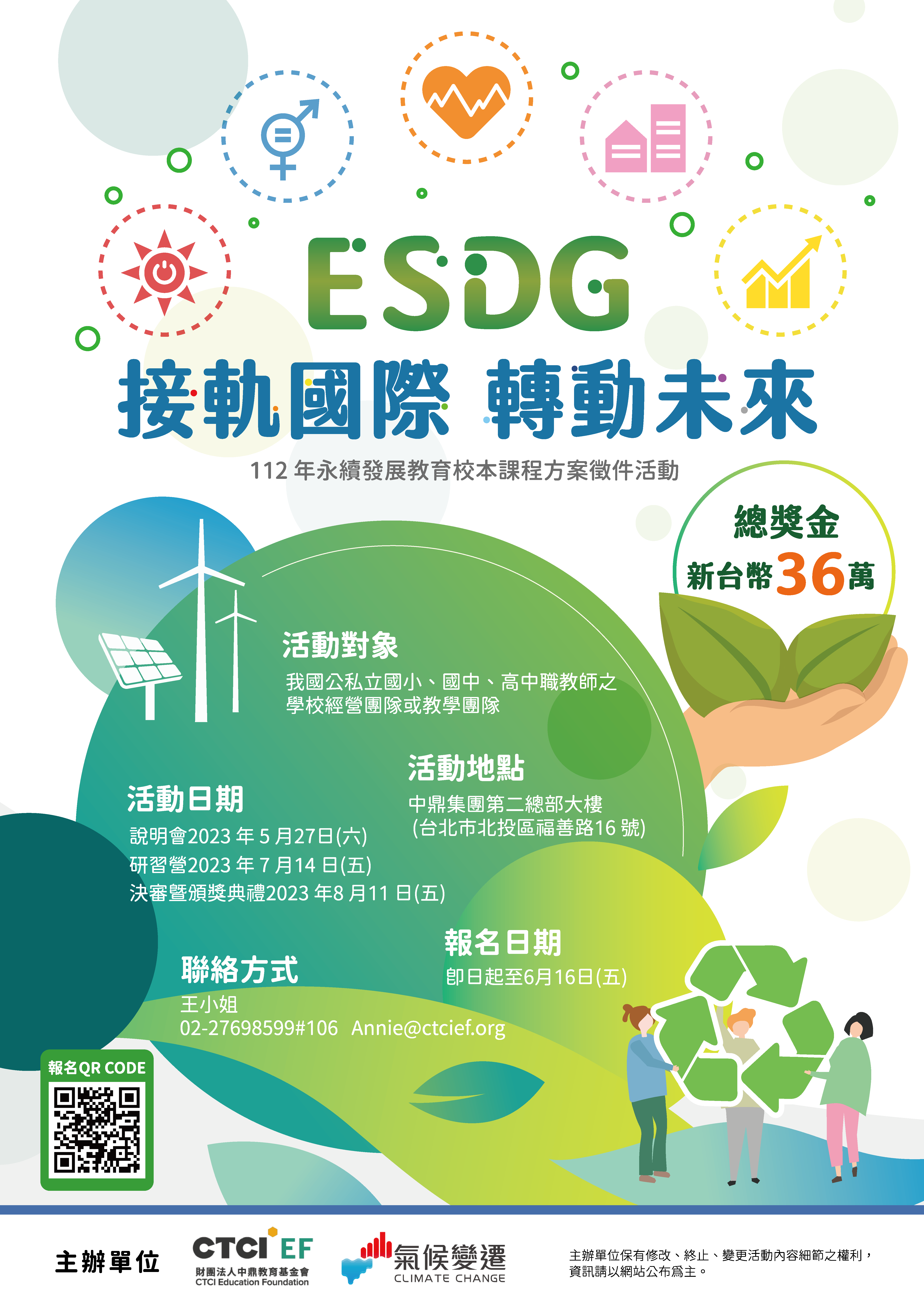 財團法人中鼎教育基金會辦理「ESDG接軌國際、轉動未來-112年永續發展教育校本課程方案徵件活動」事宜,請有興趣老師自行報名參加(請參閱附件資料)。