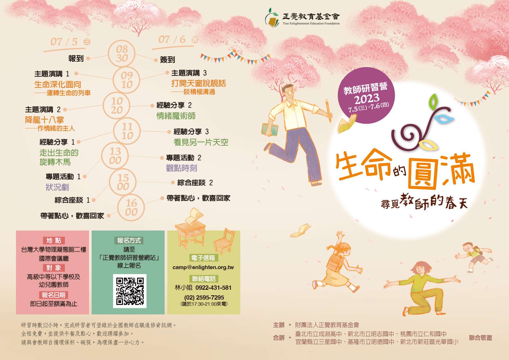 三、本校與財團法人正覺教育基金會合辦2023年生命教育「生 命的圓滿——尋覓教師的春天」教師研習活動,規劃如 下: