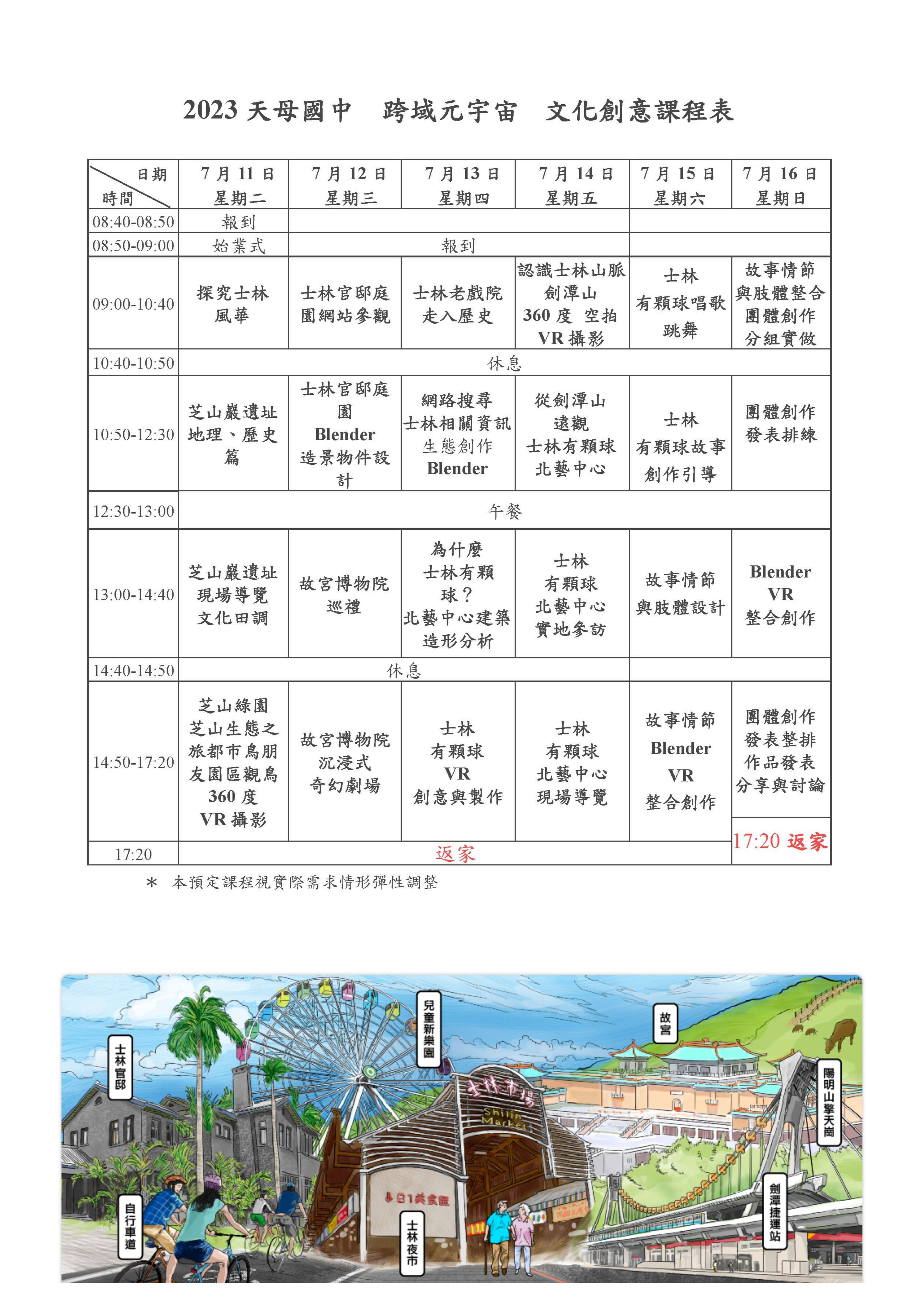 二、活動地點:天母國中美術教室、表藝教室、電腦教室、臺北藝術中心、劍潭山、芝山綠園、芝山巖、士