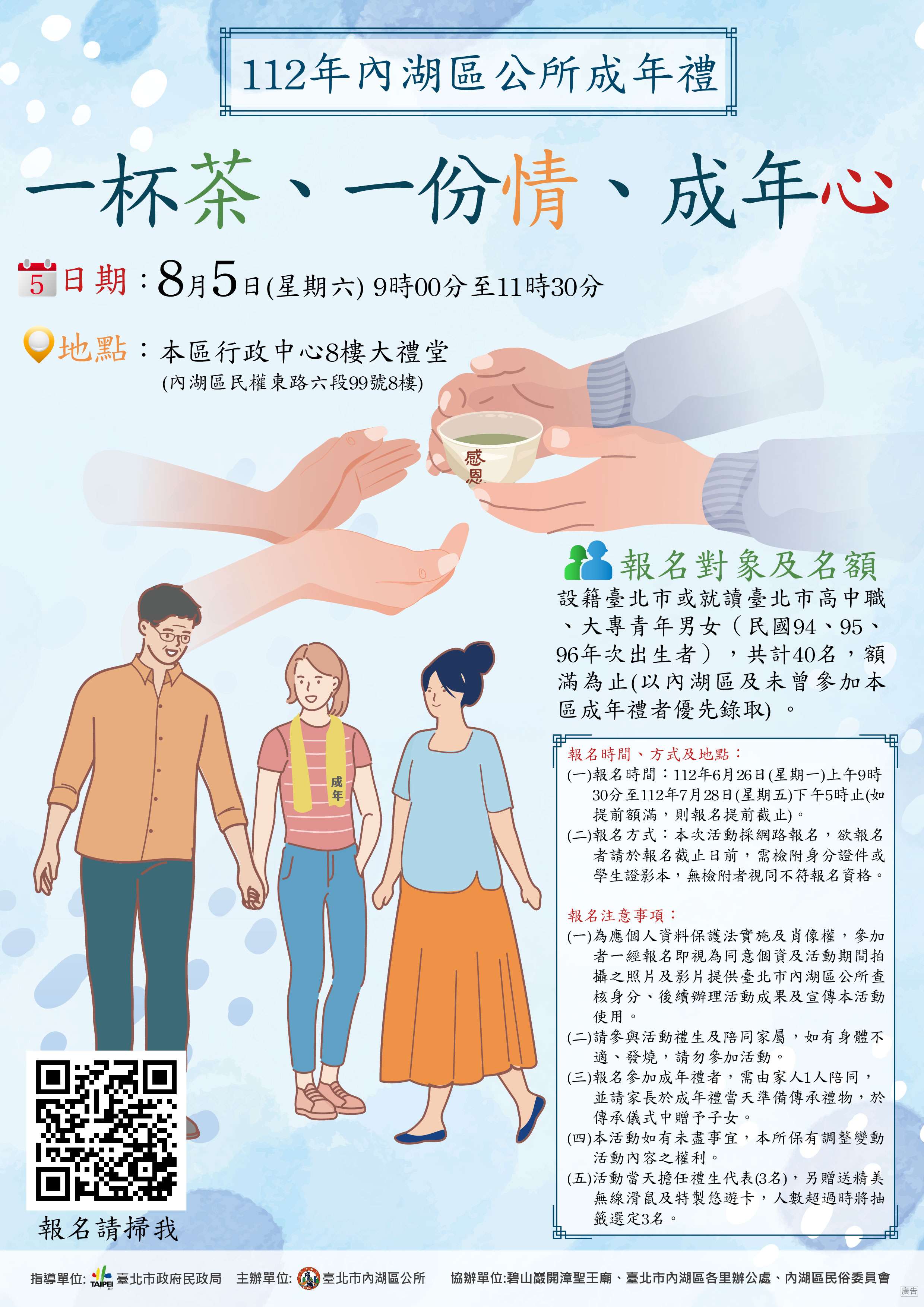 二、宣導文稿如下,請參酌使用:「臺北市內湖區公所112年度 成年禮活動,訂於8月5日(星期六)上午9時舉辦,凡成功 報名並全程