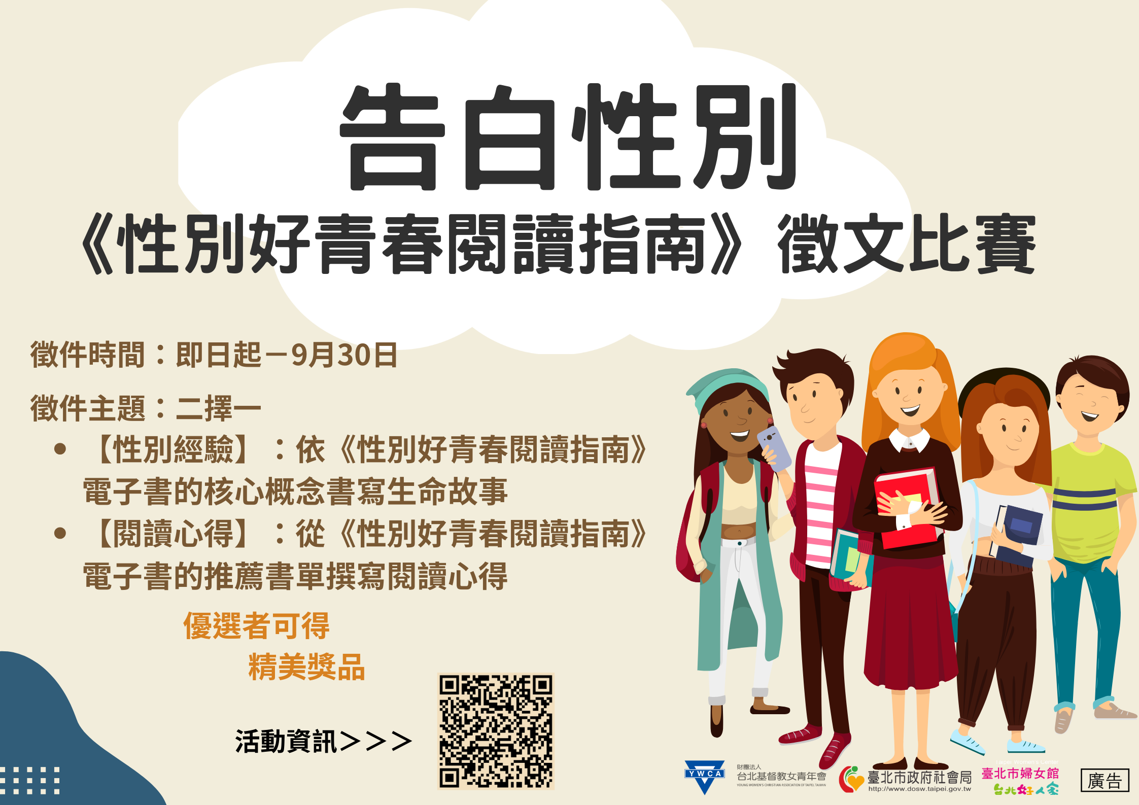 一、臺北市政府社會局委託台北基督教女青年會經營管理臺北 市婦女館,本計畫的目的係根據臺北市婦女館111年制訂的 性列平等教材《性別好青春閱讀指南》辦理徵文比賽,邀 請青少年、大專院校學生以及一般大眾,述說性別經驗或 閱讀心得。