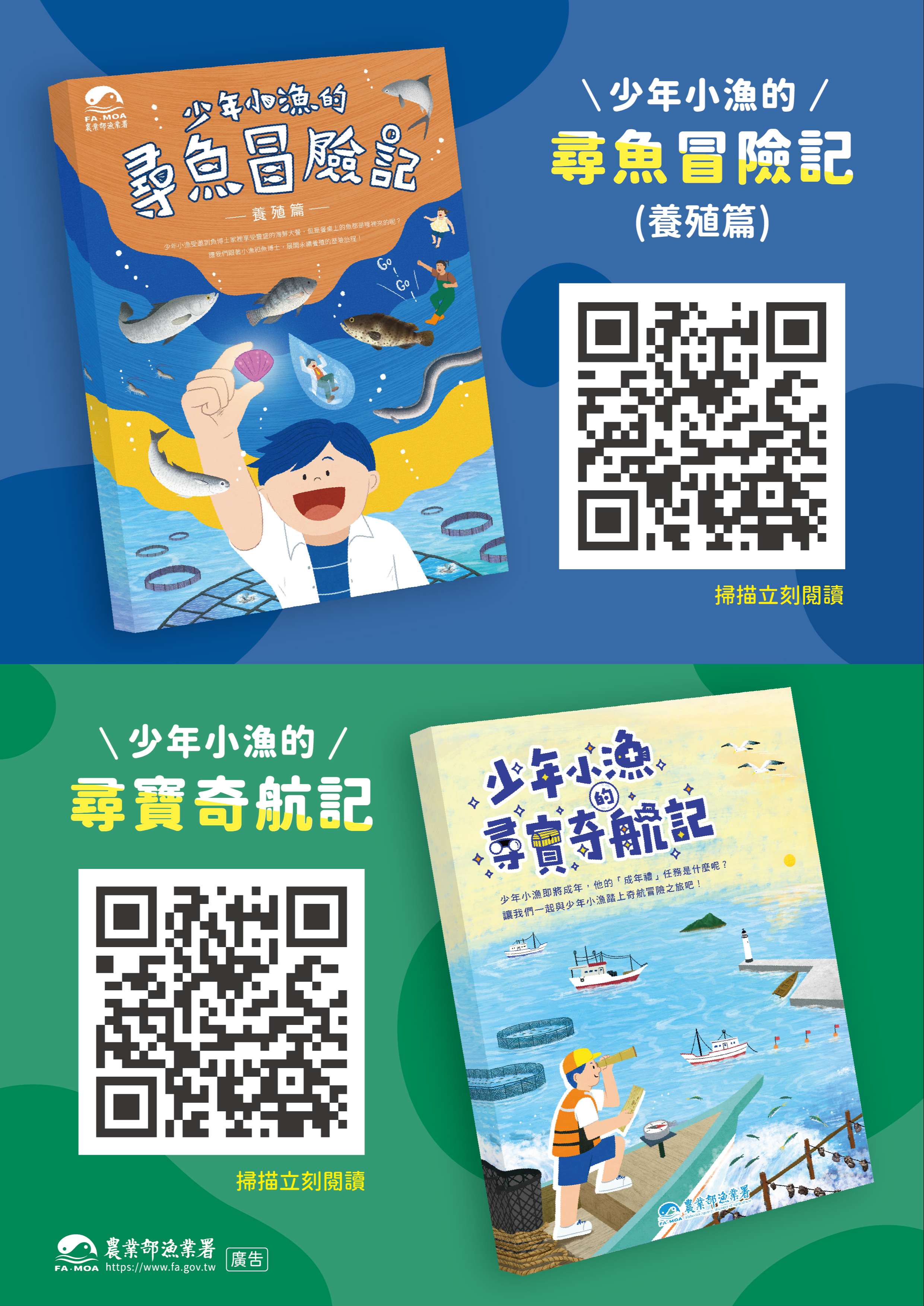 臺北市政府教育局檢送農業部漁業署出版之「少年小漁的尋寶奇航記」及「少年小漁的尋魚冒險記(養殖篇)」電子繪本之宣傳圖卡1份,請教師下載電子繪本,並請老師融入課程教學及學生學習使用 (請參閱附件資料)。