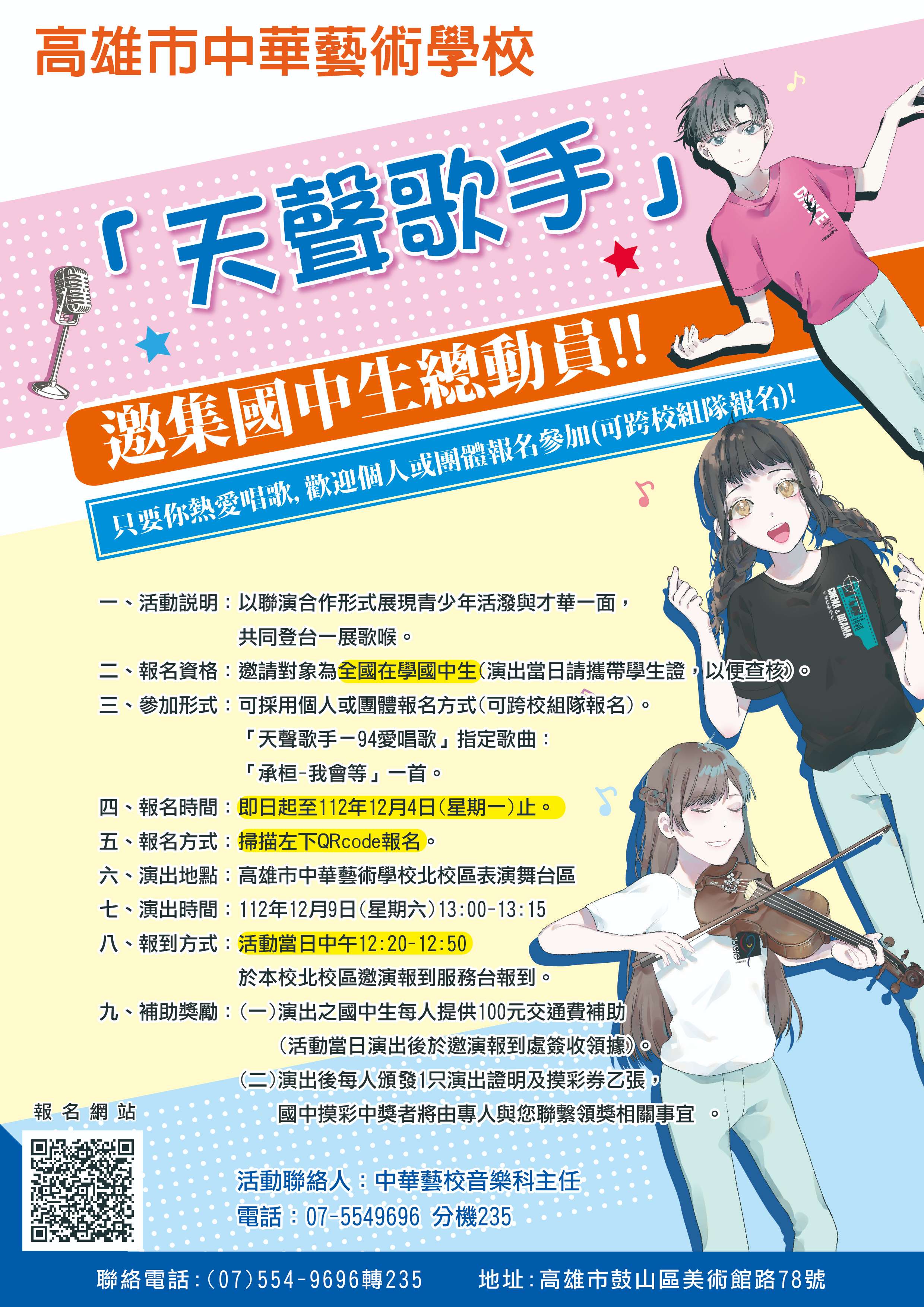 四、本案聯絡人:中華藝校音樂科主任(電話:07-5549696分機 235)。