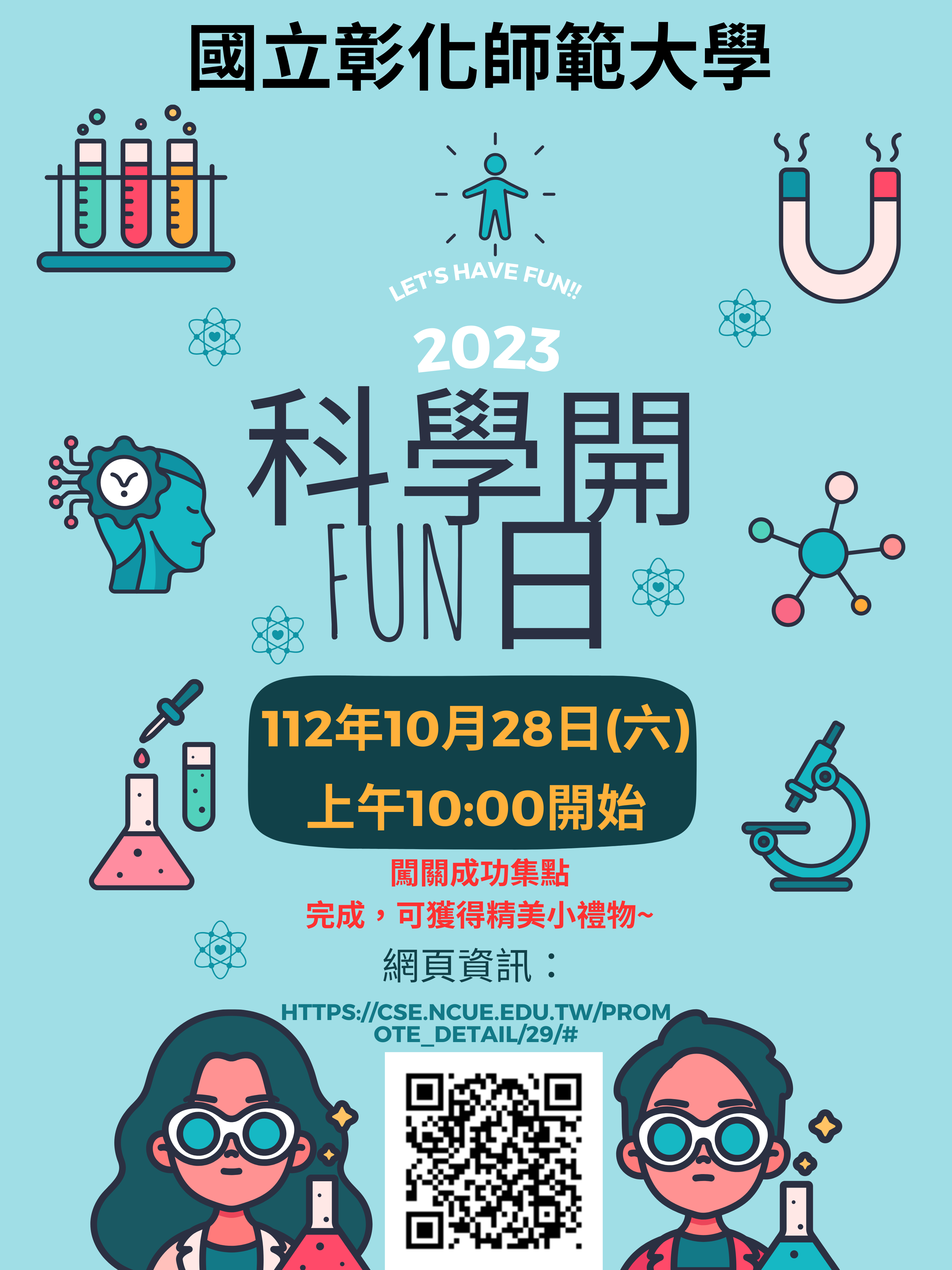 國立彰化師範大學轉知將舉辦「2023年科學開Fun日活動」,開放本校理學院教師研究室提供參觀體驗,並同時辦理科趣攤位並由工學院提供新興AI教具展示,請有興趣教師及學生自行報名參加(請參閱附件資料)。