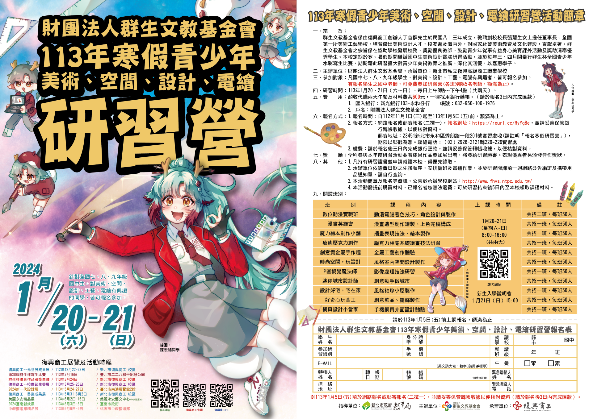 六、報名方式:請填妥網路報名簡章及銀行轉帳。網址: https://reurl.cc/RyYg8e地址:23451新北市永和區秀朗路一段201號 七、報名時間:112年11月01日(三)起至113年1月05日(五)前, 額滿為止。任何課程相關問題,聯絡電話(02)2926-2121 轉226~229。 八、報名簡章:如附件。