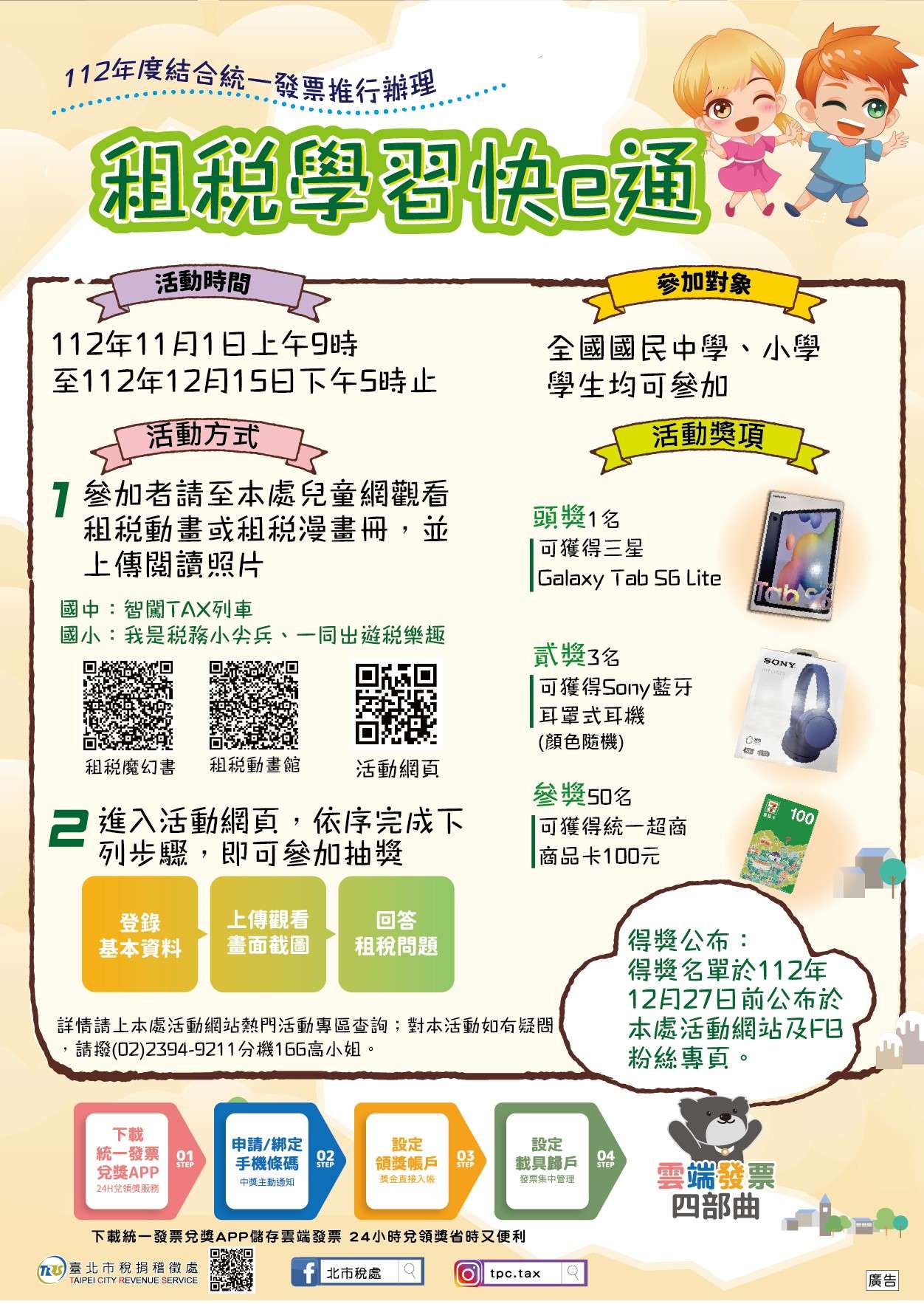 二、旨揭活動相關訊息: (一)活動時間:即日起至112年12月15日下午5時止。 (二)活動內容:國中、國小學生於活動期間至「臺北市稅捐稽徵處兒童網」觀看租稅教育動畫或漫畫,將閱讀情形拍照上傳活動網頁,並正確回答租稅問題,就有機會獲 三星Galaxy TabS6 Lite、Sony藍牙耳罩式耳機及統一超商商品卡100元等多項好禮! (三)活動詳情請參閱活動網頁(網址:https:services. arpa. tpctax.dof.gov.taipei/act/1121earning/)。