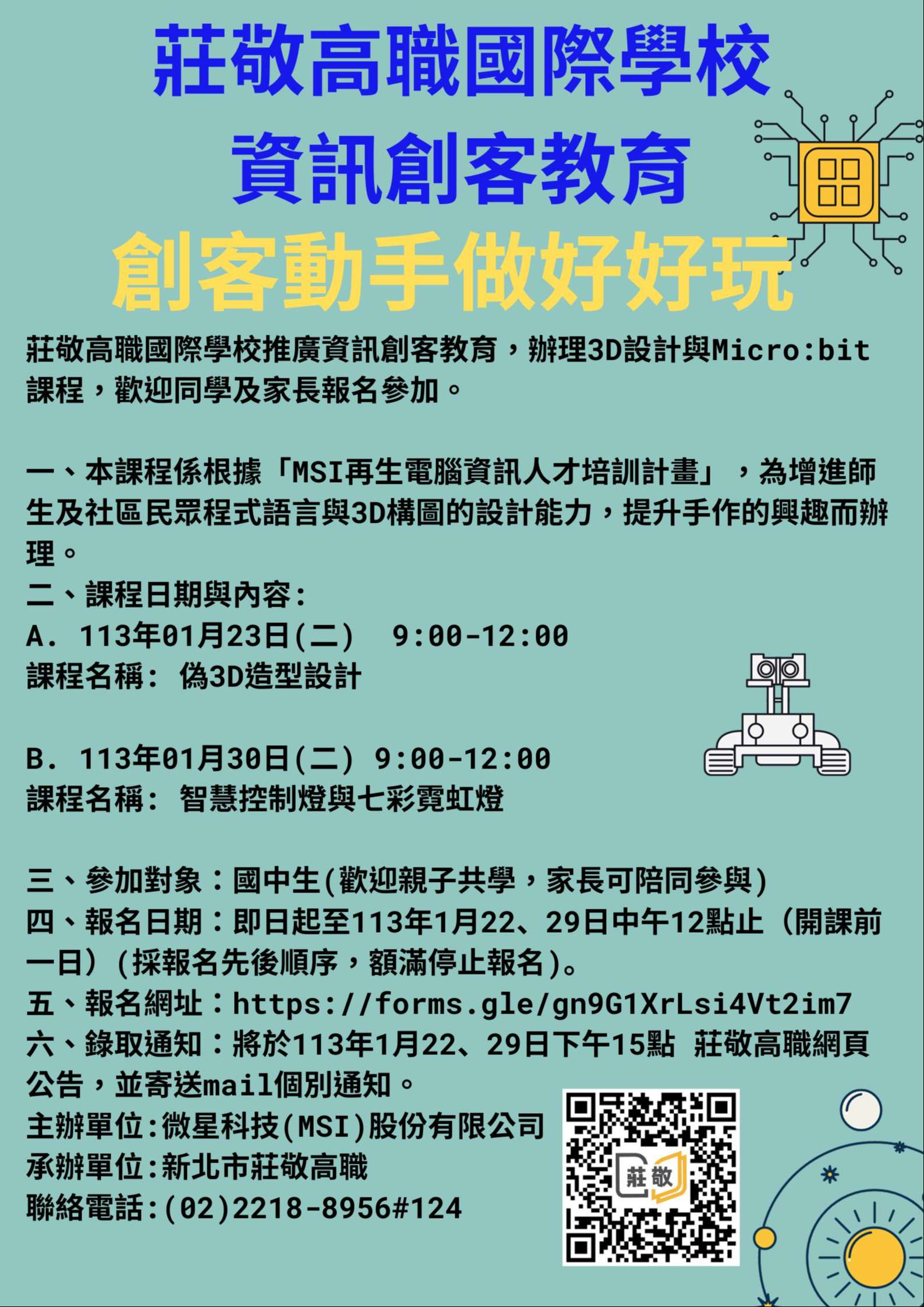 六、錄取通知:將於113年1月22、29日下午15點 莊敬高職網頁公告,並寄送mail個別通知。 主辦單位:微星科技(MSI)股份有限公司 承辦單位:新北市莊敬高職 聯絡電話:(02)2218-8956#124