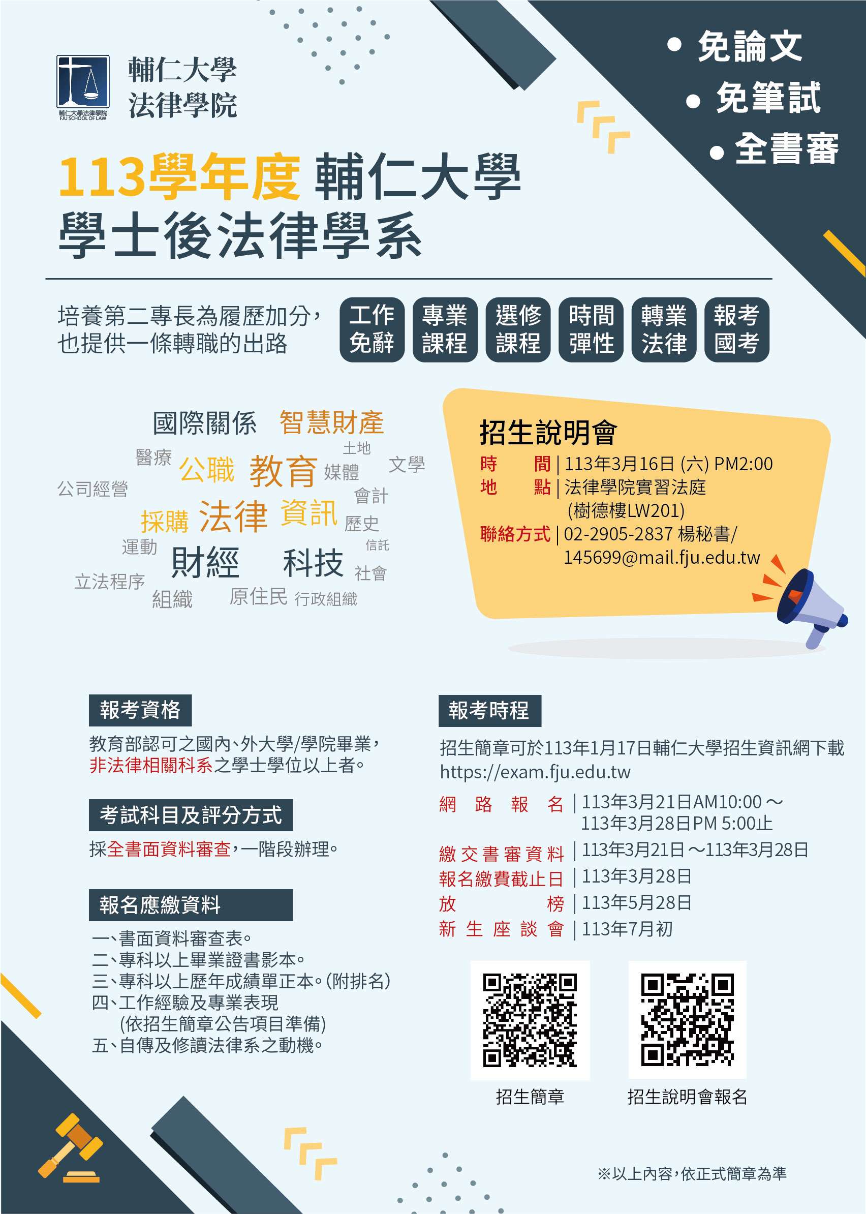 八、招生說明會時間 : 113年3月16日(六) 14:00-16:00。 輔仁大學 樹德樓2樓 實習法庭 (LW201) 報名說明會 : https://forms.gle/7cdzjU72M5sGKTDr7