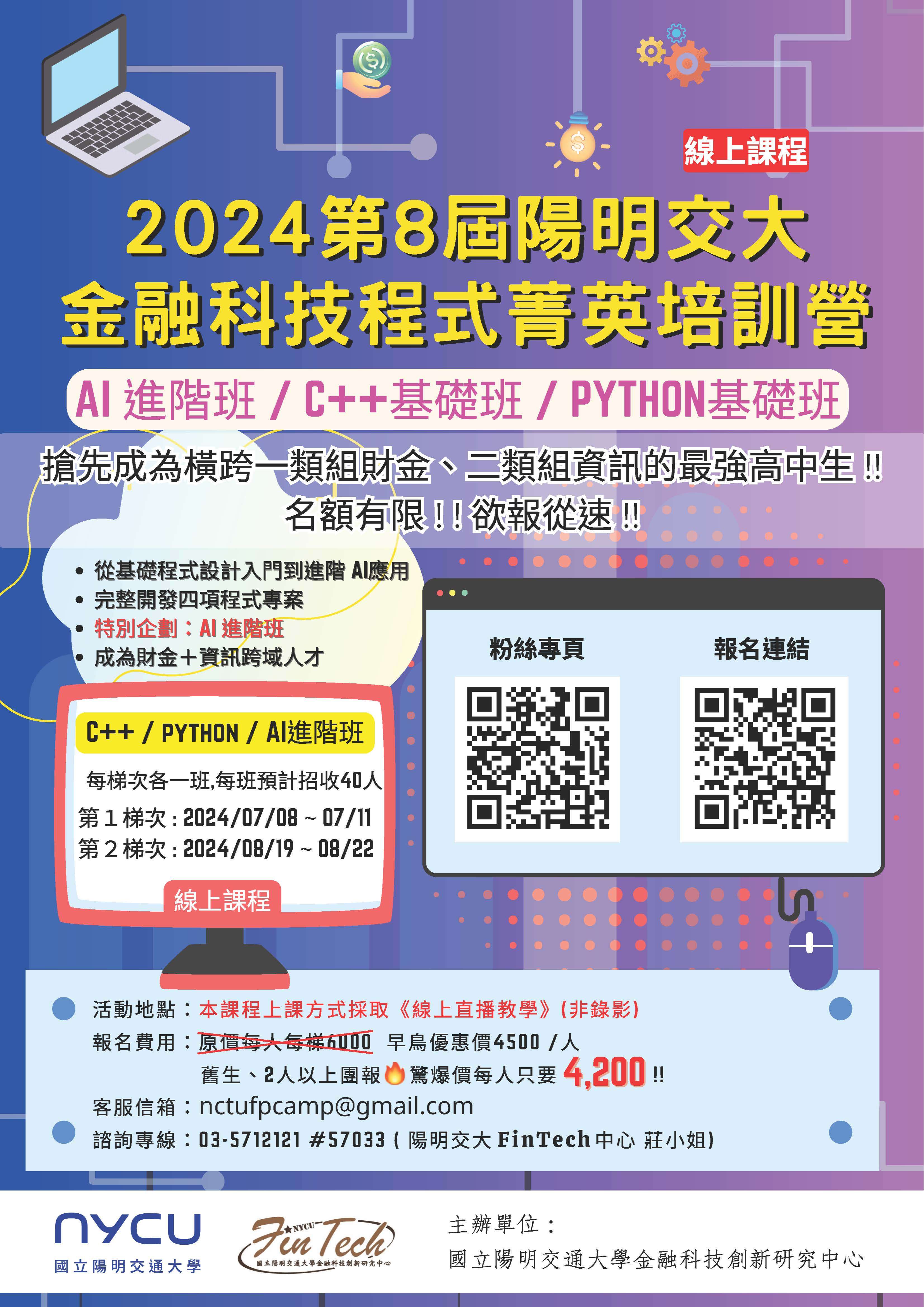 一、2024 「第8屆陽明交大金融科技程式菁英培訓營(線上課 程)」藉由豐富有趣的課程規劃、深入淺出教學,輕鬆地學 習C++、Python之基本概念與實作技巧。今年特別開辦「AI 進階班」,名額有限敬請把握!