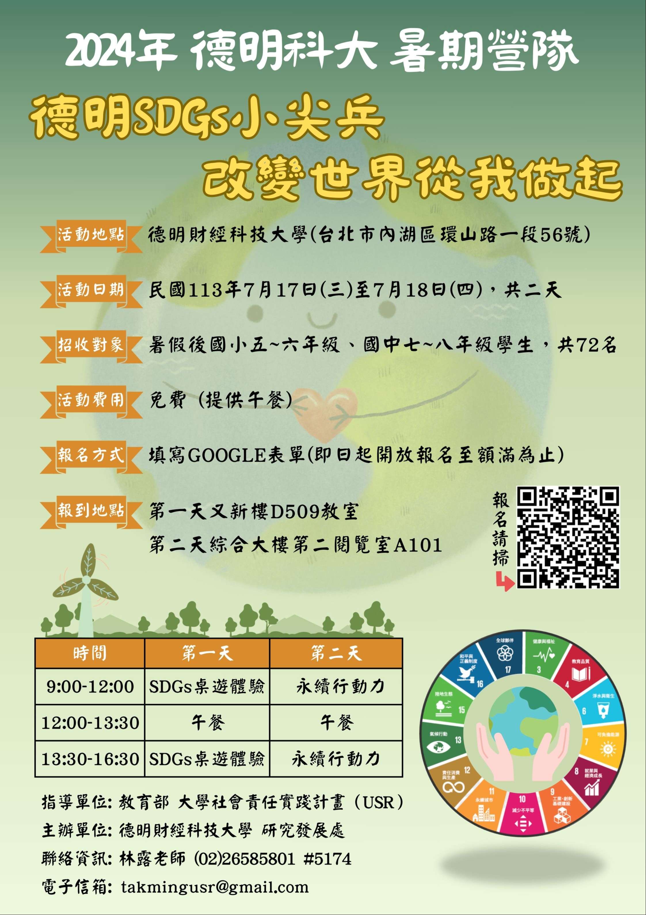 四、檢附營隊簡章及宣傳海報電子檔各1份,若有問題,請洽活動聯絡人:林露老師,電話:02-26585801轉5174,電子信 箱:takmingusr@gmail.com。