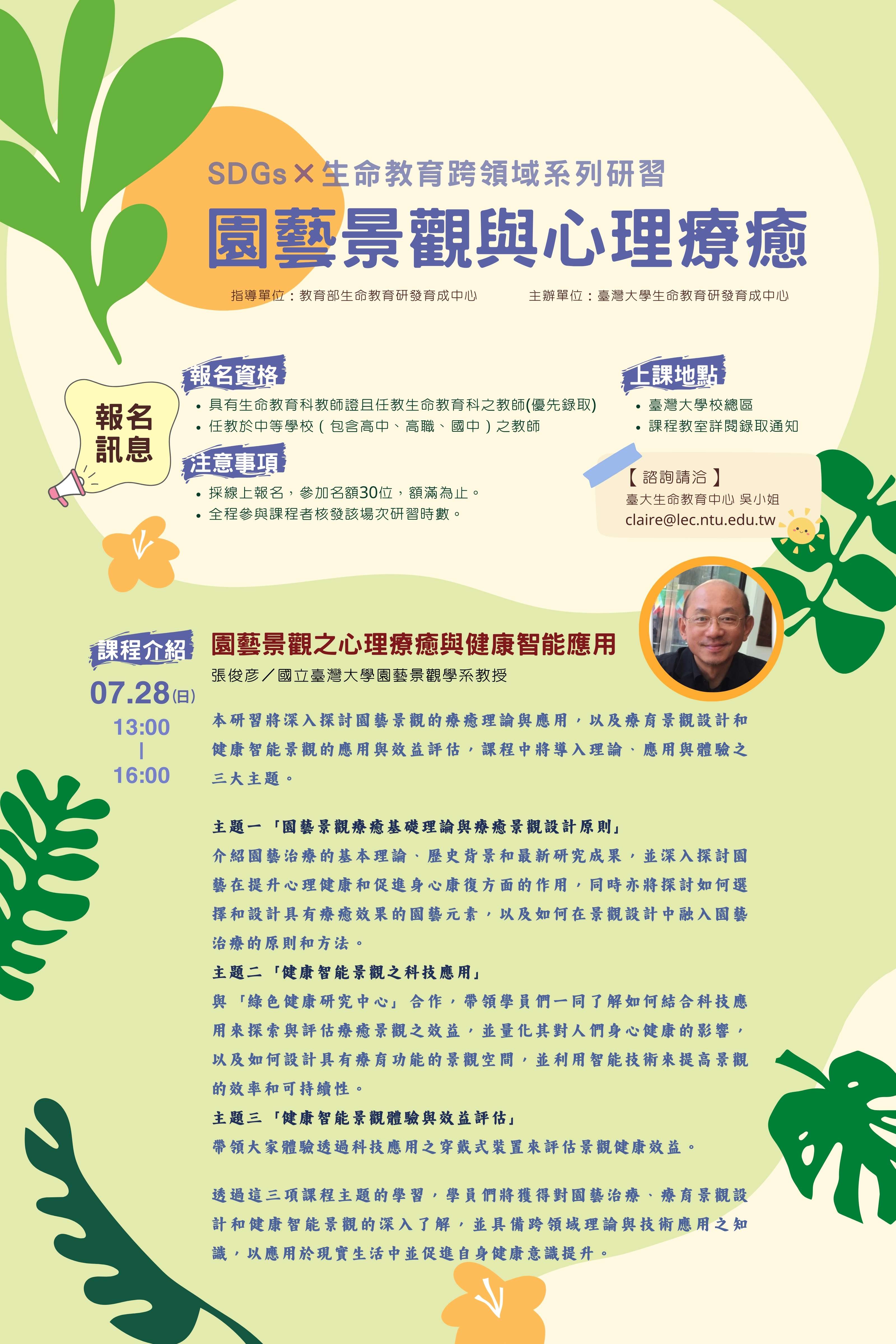 2、7月28日:園藝景觀之心理療癒與健康智能景觀應 用。