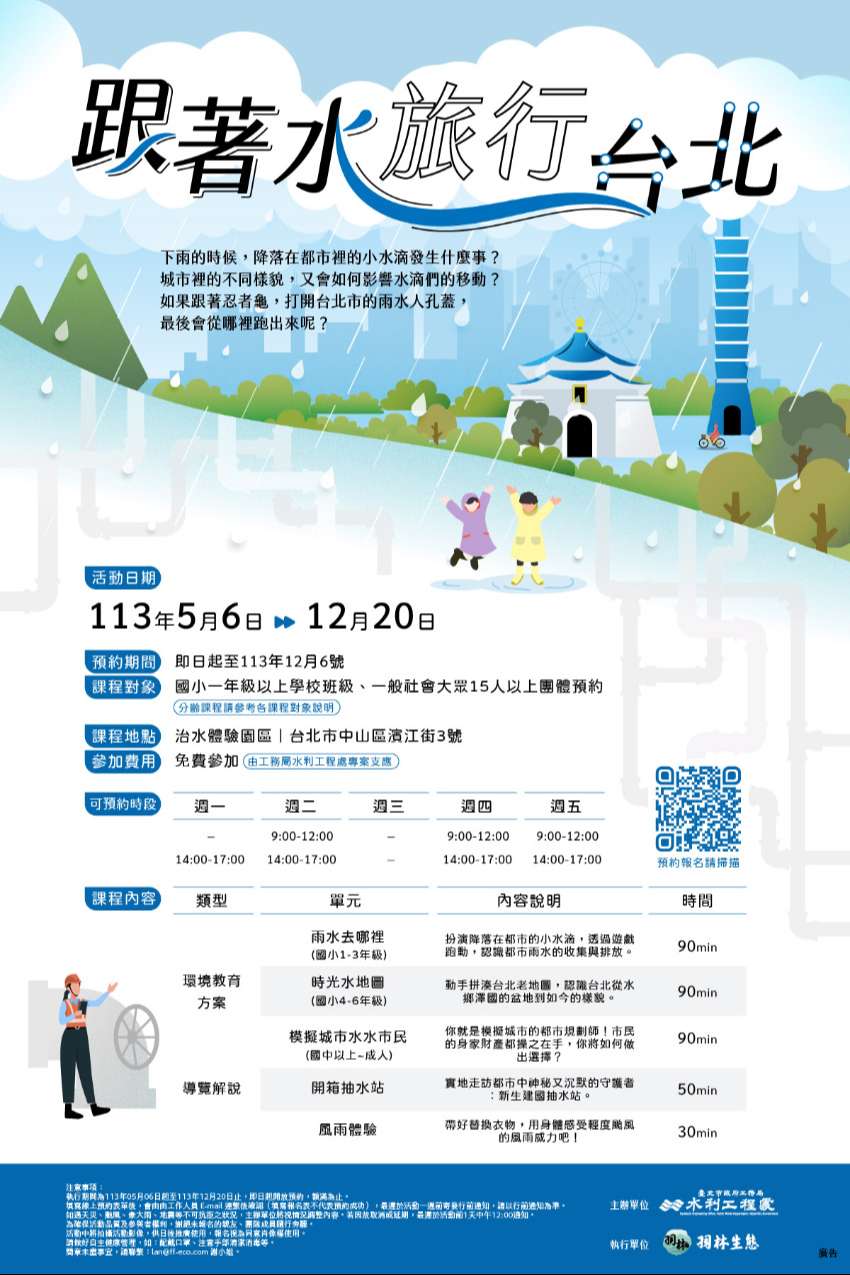 一、旨揭課程包含防減災與氣候變遷調適議題,可搭配國中小及高中之社會與自然領域教學,即日起至113年12月6日開放國小一年級以上學校班級及一般社會團體免費預約,預約網址為https://reurl.cc/vvk8LA。
