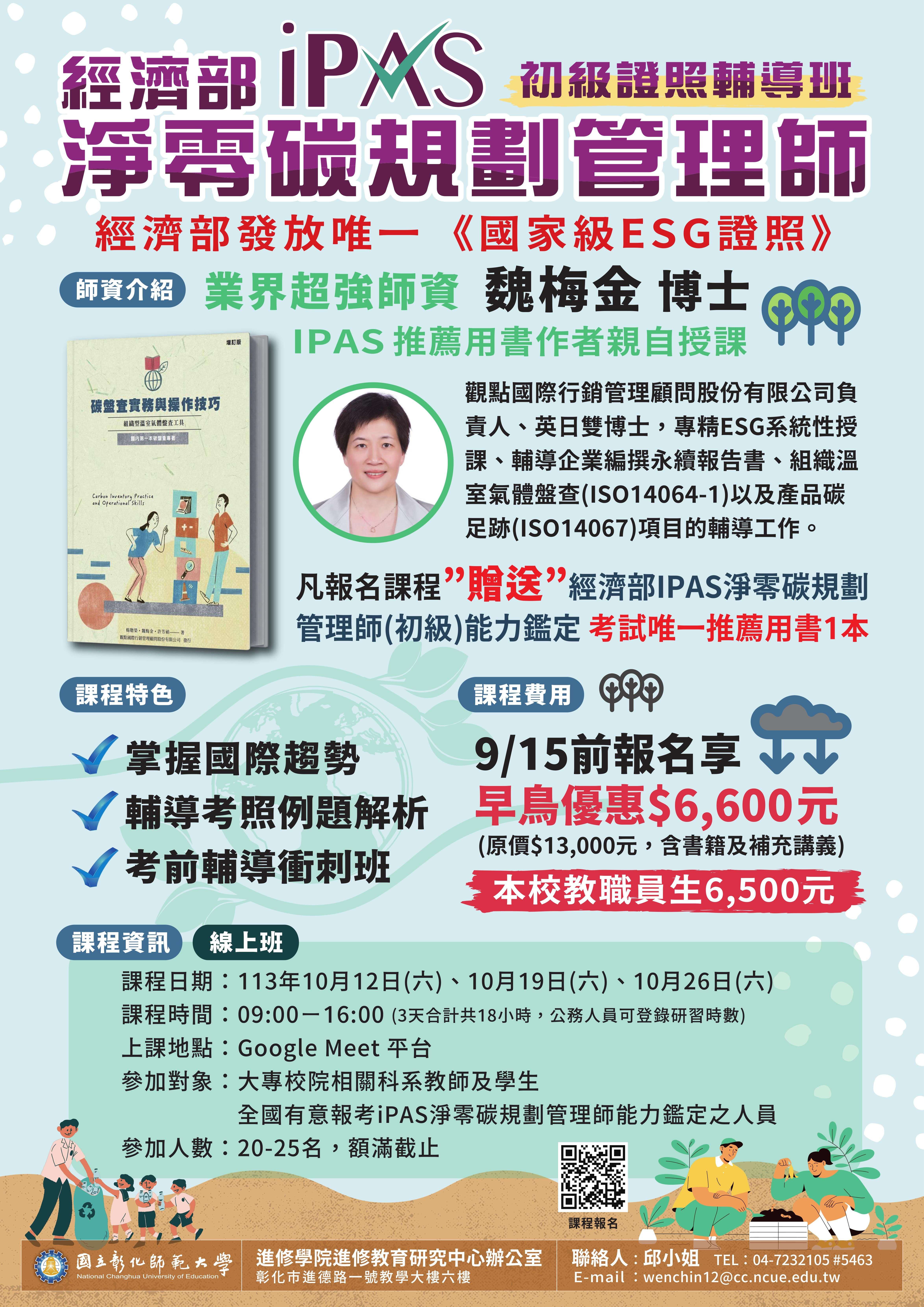 一、「113年iPAS淨零碳規劃管理師(初級)能力鑑定輔導班(線上班) 」