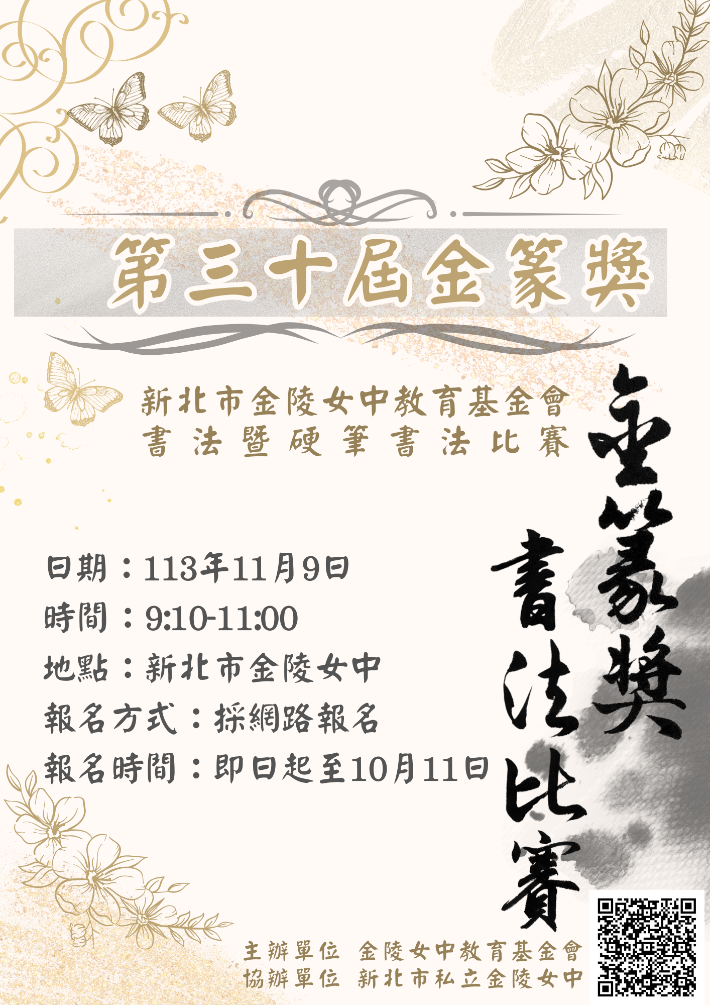 新北市金陵女中教育基金會第30屆金篆獎書法暨硬筆書法比賽辦法如附件。