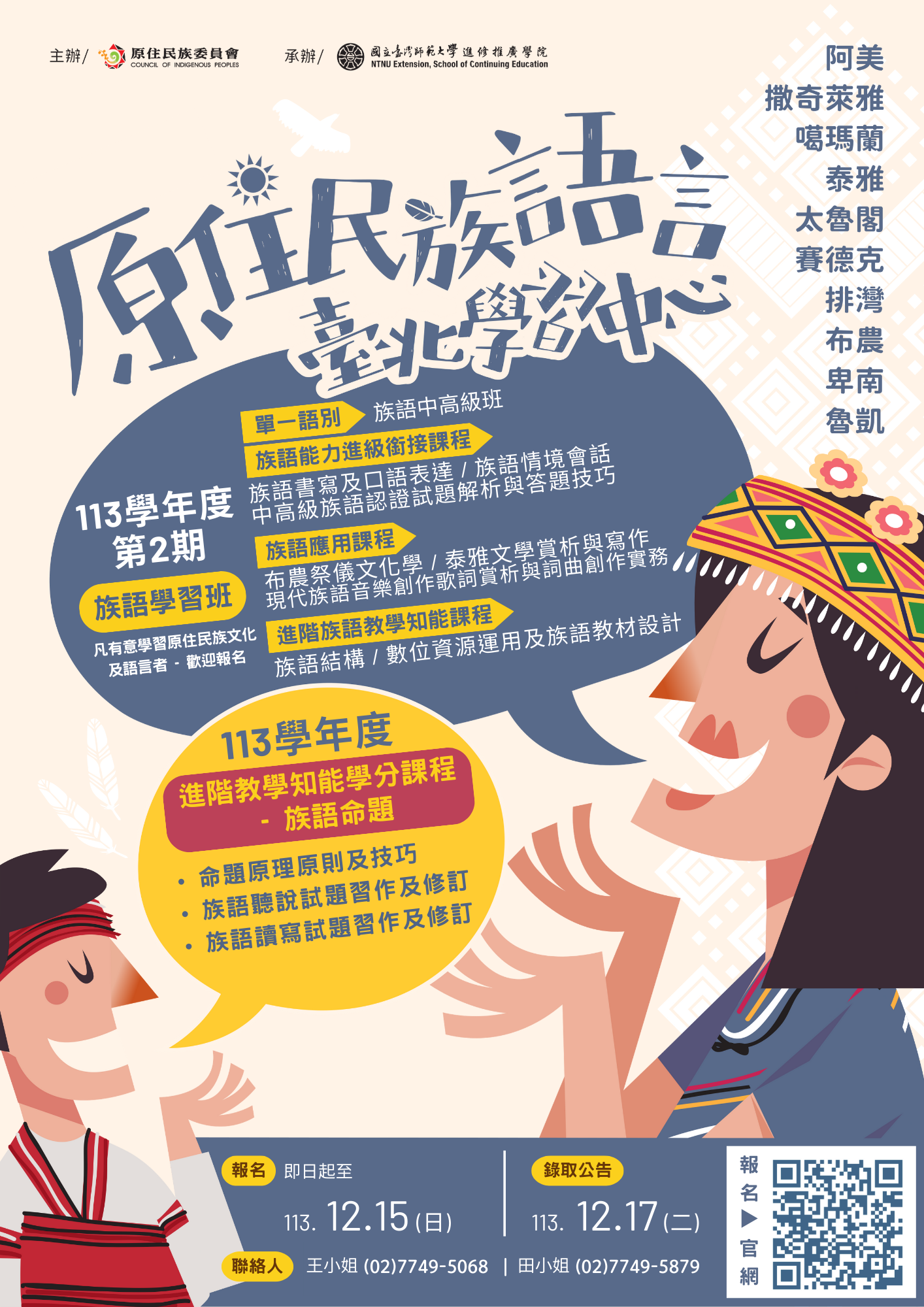 三、本班招生對象針對有意學習阿美族、噶瑪蘭族、撒奇萊雅 族、泰雅族、太魯閣族、賽德克族、排灣族、布農族、卑 南族、魯凱族等族語者。 四、本班即日起受理報名至113年12月15日(星期日)下午5時 止,相關招生訊息及報名資訊,請參考附件或至網站查詢(https://ntnucamp.sce.ntnu.edu.tw/allc/news/)。