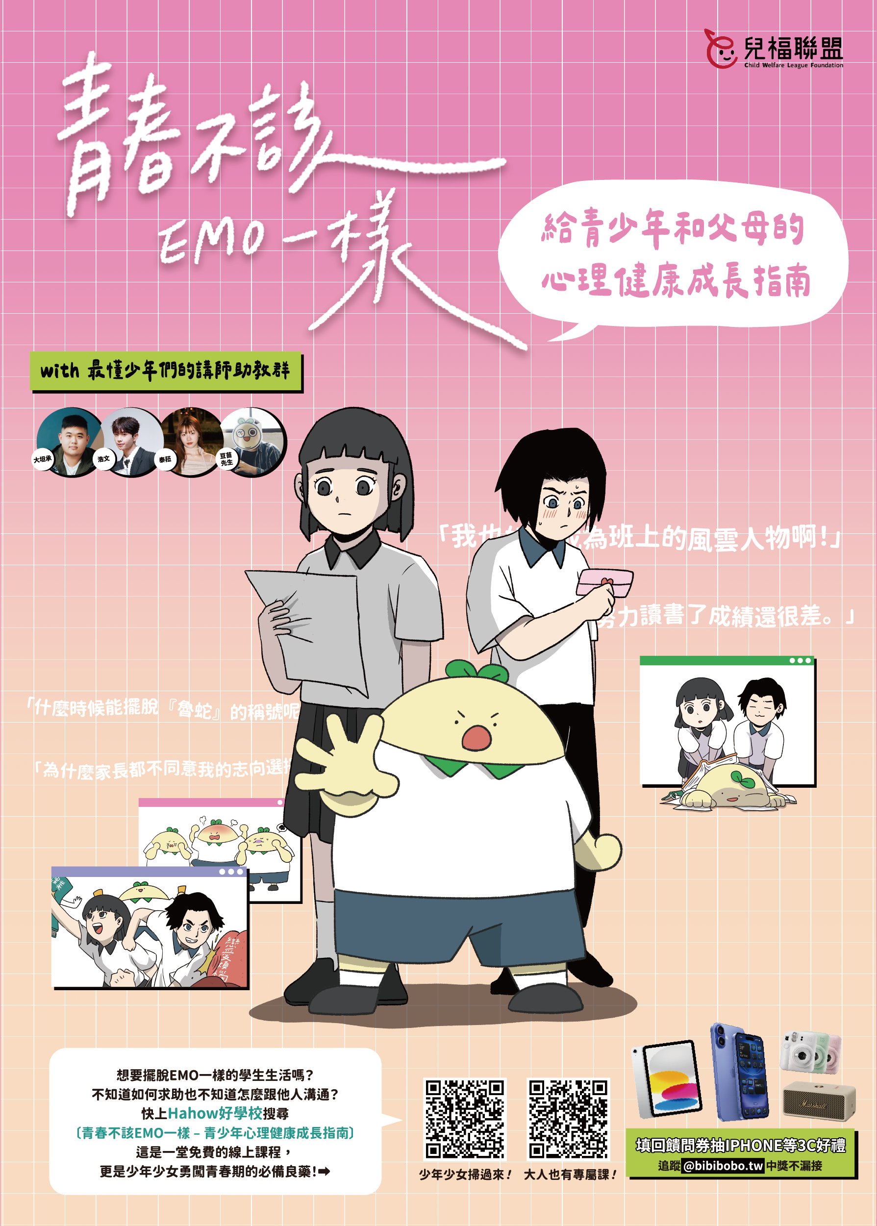 三、本會辦理《青春不該EMO一樣》青少年心理健康免費線上課程,提供系統性的心理保健知識,協助青少年正向面對情 緒、抒發壓
