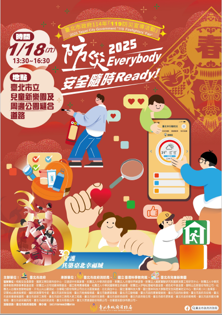 二、旨揭活動訂於114年1月18日(星期六)13時30分至16時30 分,假臺北市立兒童新樂園及周邊公園縫合道路舉行,藉 由防災園遊會方式,透過宣導攤位與民眾互動、傳達及教 導民眾家庭防災之觀念,以提升民眾居家生活安全。
