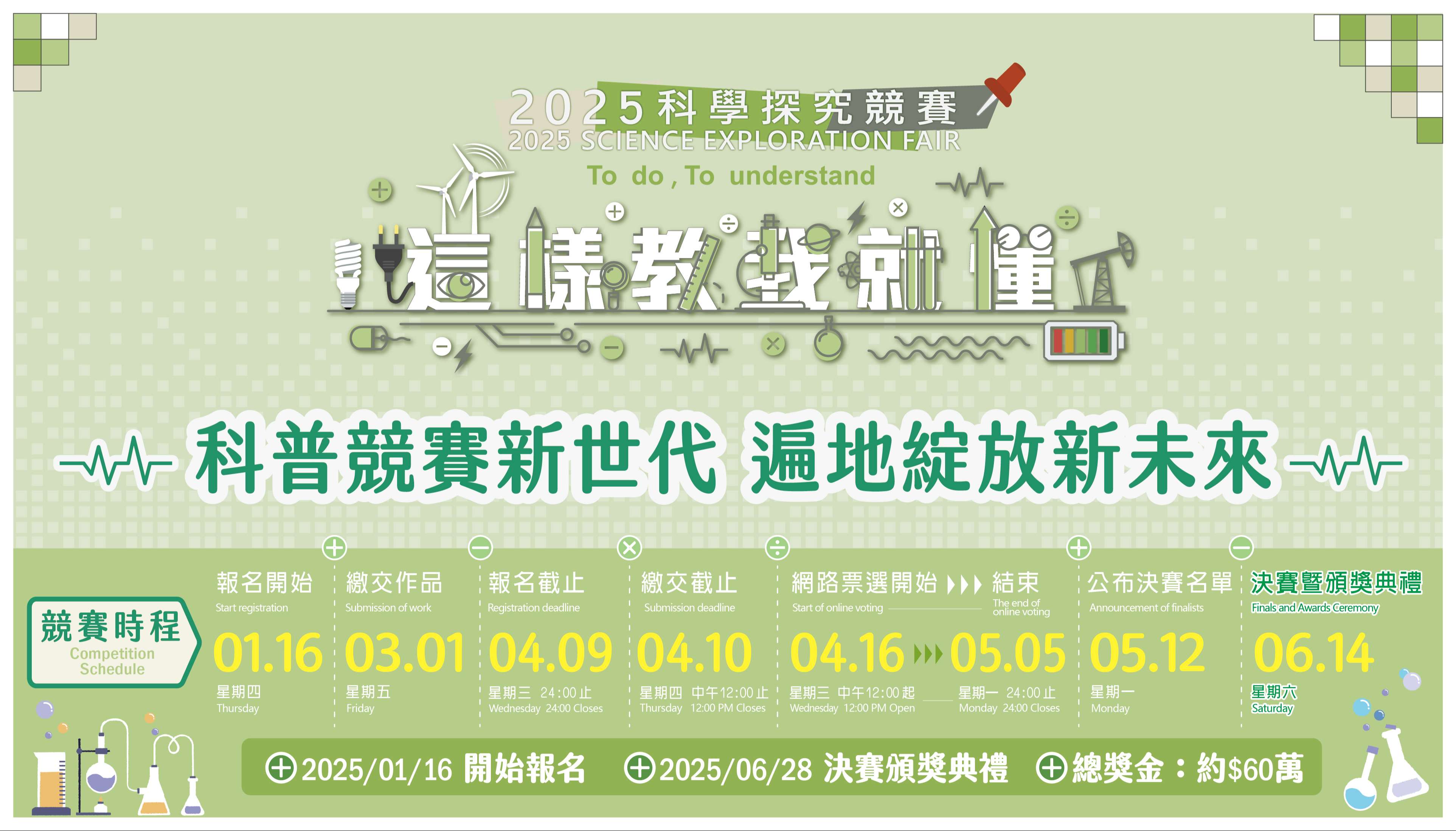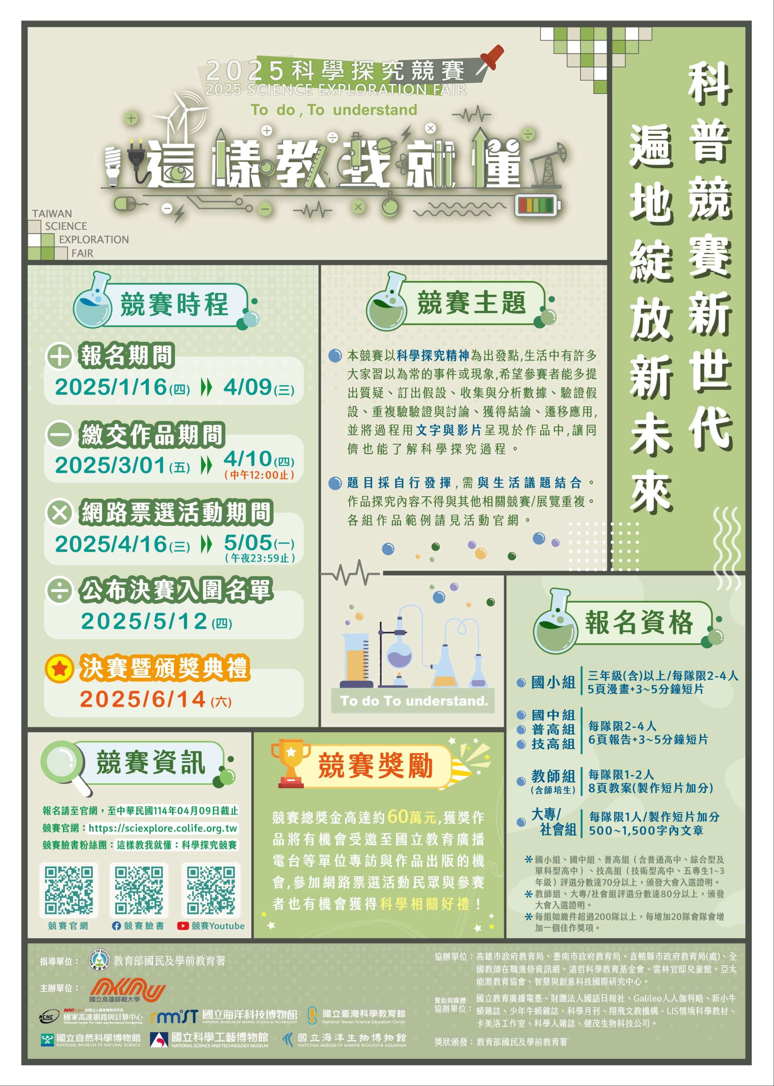臺北市政府教育局轉知國立高雄師範大學2025年「科學探究競賽-這樣教我就懂」科普競賽活動訊息一案,請有興趣教師或學生自行報名參加 (請參閱附件資料)。