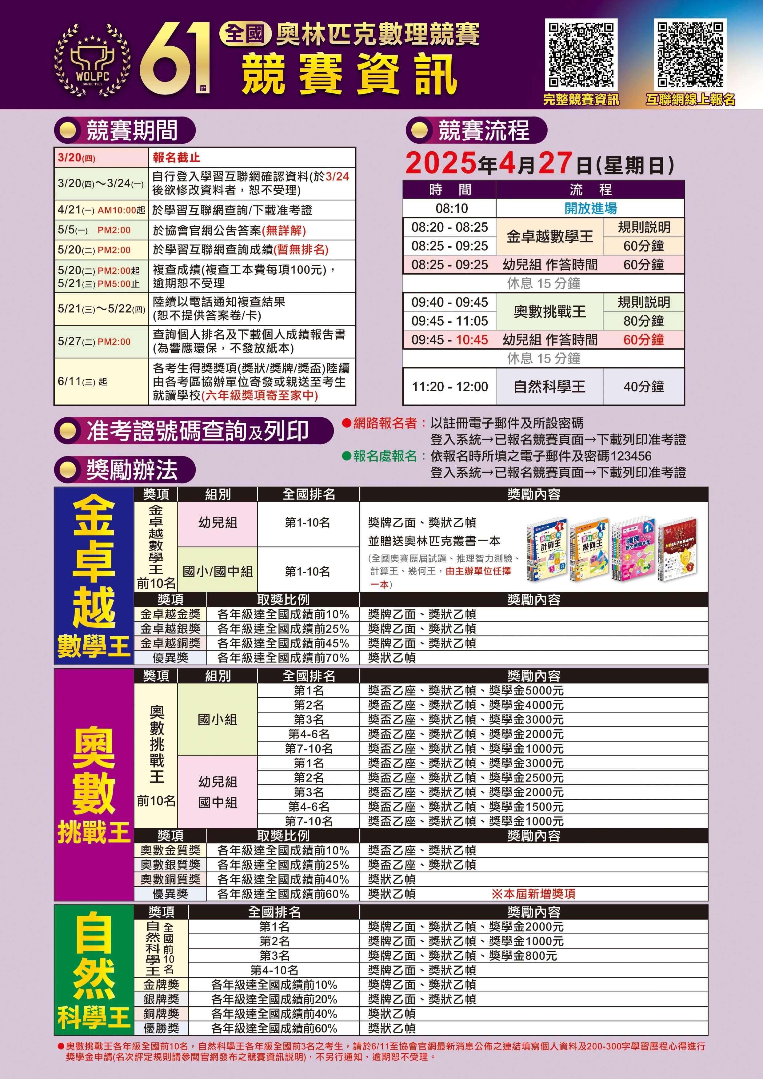 二、檢附「第61屆全國奧林匹克數理競賽」競賽活動簡章,供 貴校參閱。