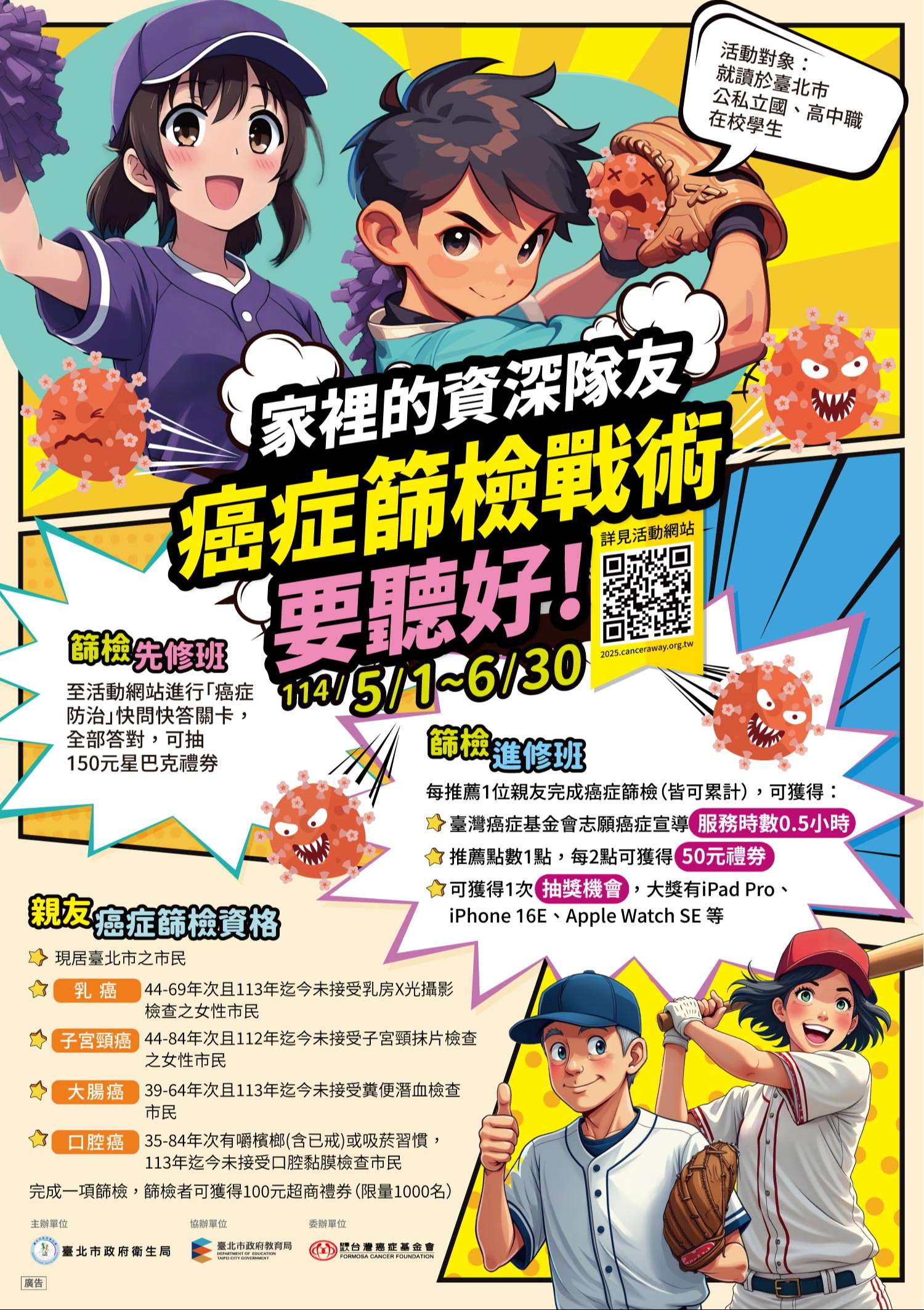 (二)活動對象: 1、就讀於本市公私立國、高中職在校學生。 2、上述學生親友,且居住本市並符合四癌篩檢資格之一 者。