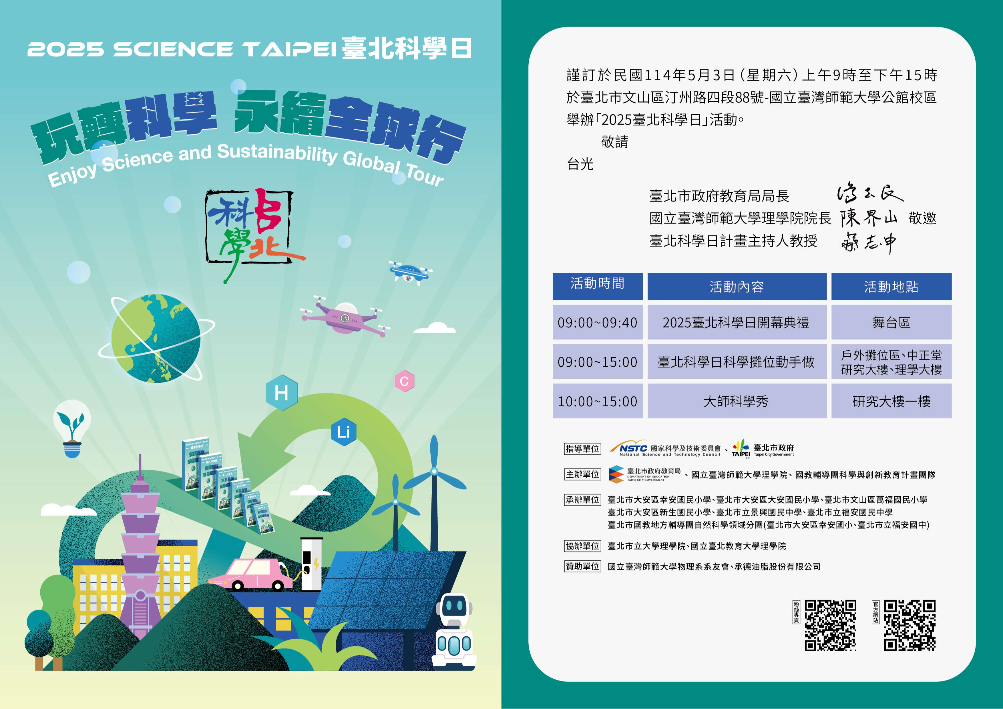 由本局與國立臺灣師範大學理學院物理學系合作舉 辦,本年度將於114年5月3日(星期六)假師大公館校區辦 理科學體驗實作活動,並響應聯合國教育科學及文化組織 「永續發展國際十年(IDSSD)」理念,藉本活動「玩轉科 學-永續全球行」之主題,彰顯本市對於推動科學教育的重 視。