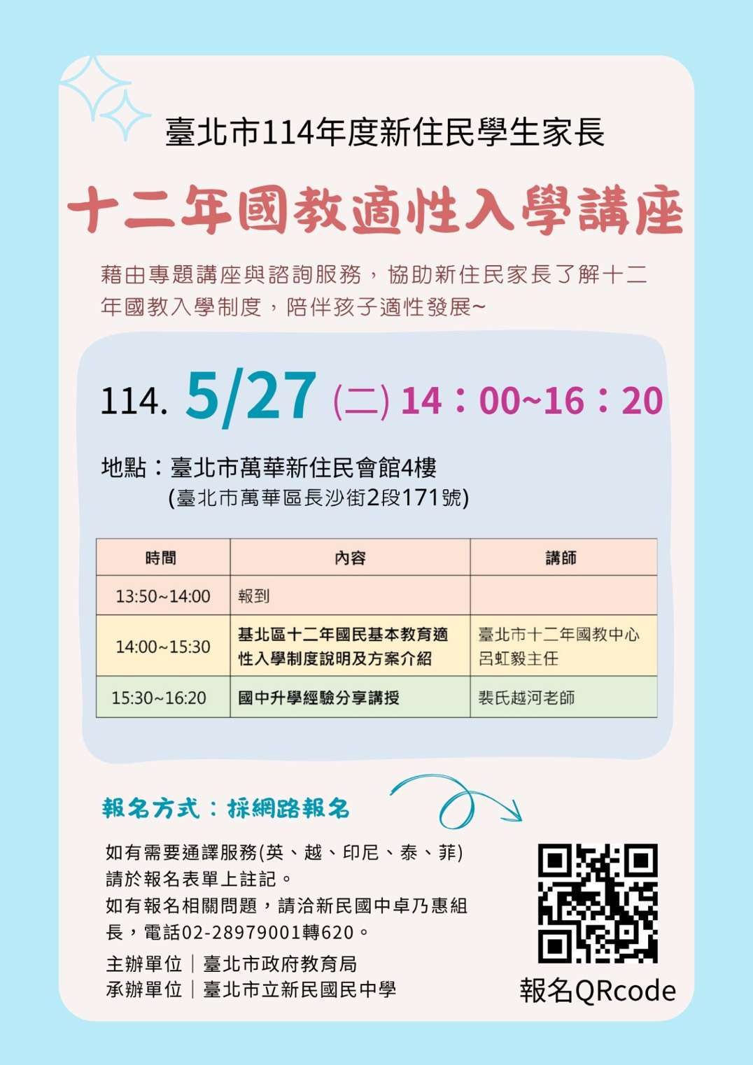 如有需要通譯服務(英語、越南語、印尼語、泰國語、菲律賓)請於報名表單上註記